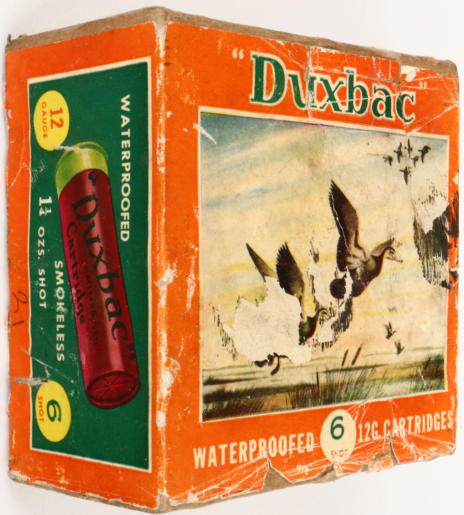 Duxbac, 12ga., 2pc., FULL, shot size 6, box is solid, Shells are very good. Grade: Excellent - Value: 8 to 30