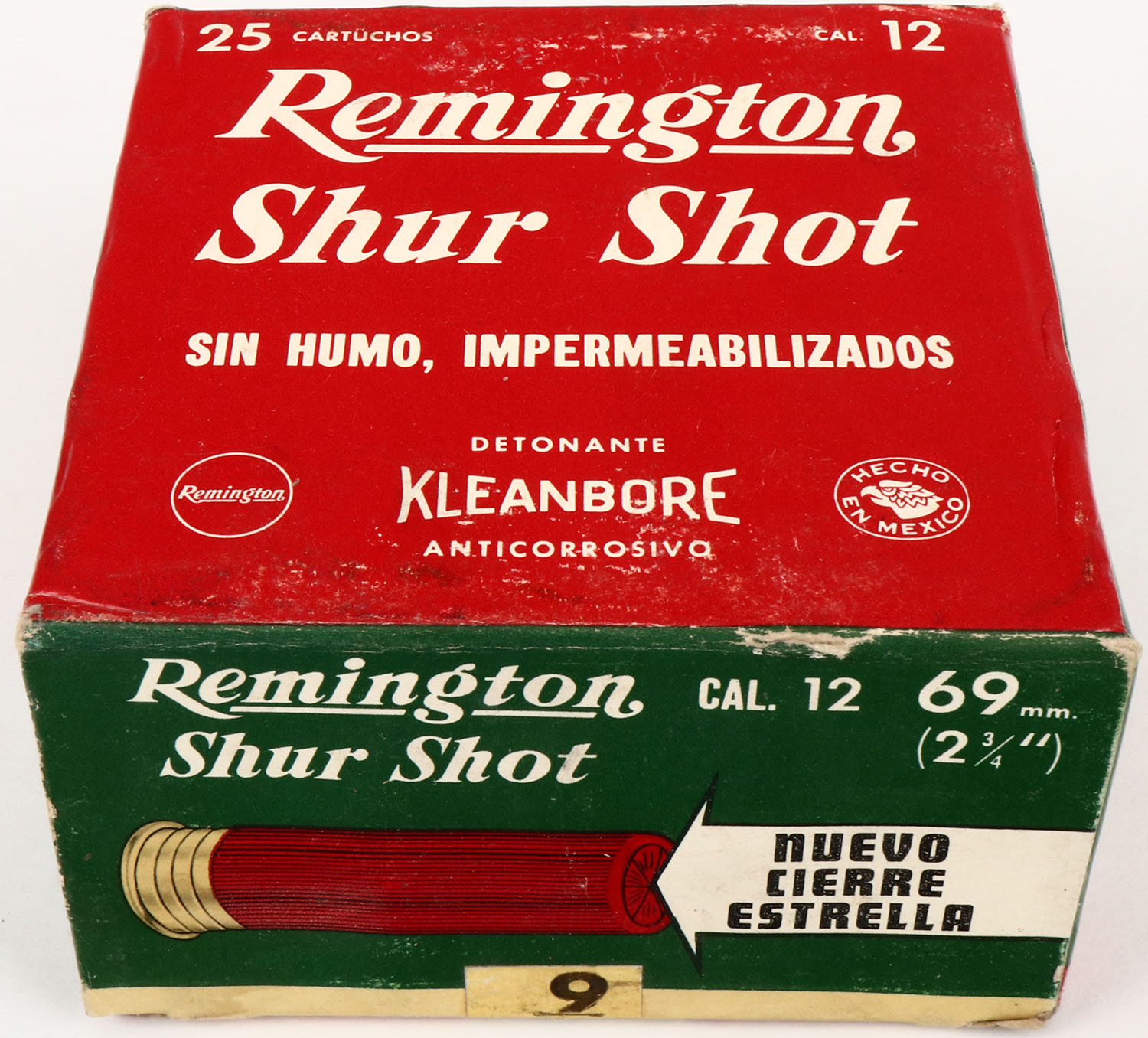 Remington, Shur Shot, Made in Mexico, 12ga., 1pc., FULL, shot size 9, box is solid, Shells are very good. Grade: Excellent - Value: 10 to 40