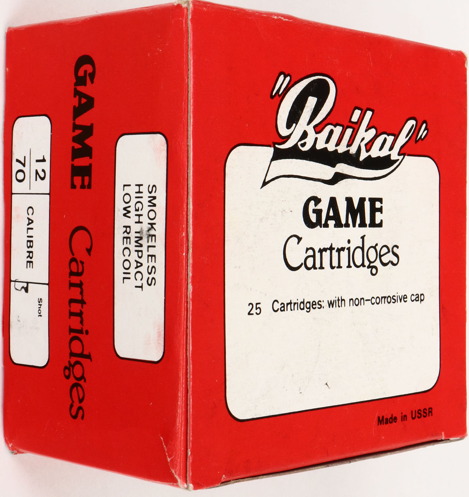 Baikal, 12ga., 1pc., FULL, shot size 3 Game, box is solid, Shells are excellent. Grade: Excellent + - Value: 8 to 20