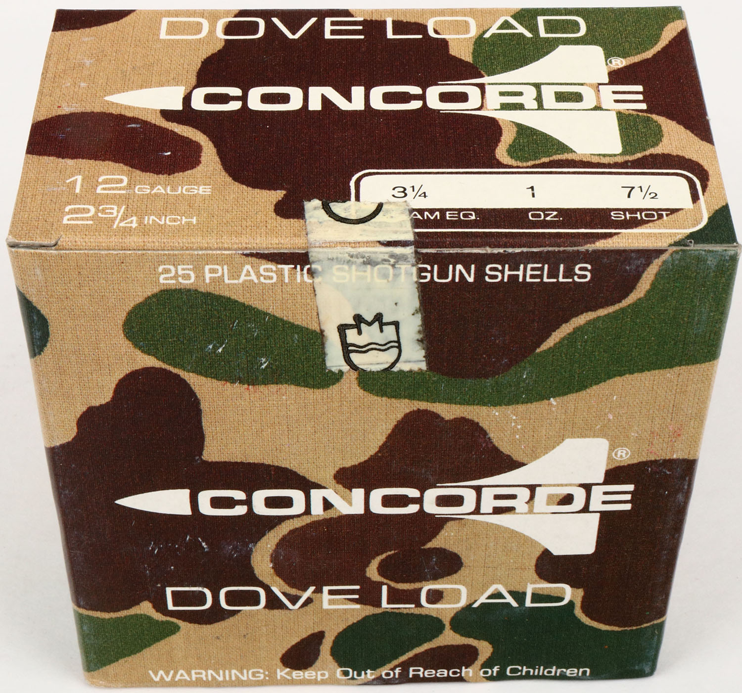 Concorde, Dove Load, 12ga., 1pc., FULL, shot size 7 1/2, box is solid, Shells are excellent. Grade: Excellent + - Value: 8 to 20