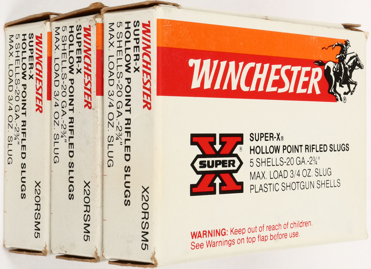 Lot of 3 Winchester Super X, 20ga., 1pc., FULL, shot size Hollow Point Rifled Slugs, boxes are solid, Shells are excellent. Grade: Excellent + - Value: 10 to 30