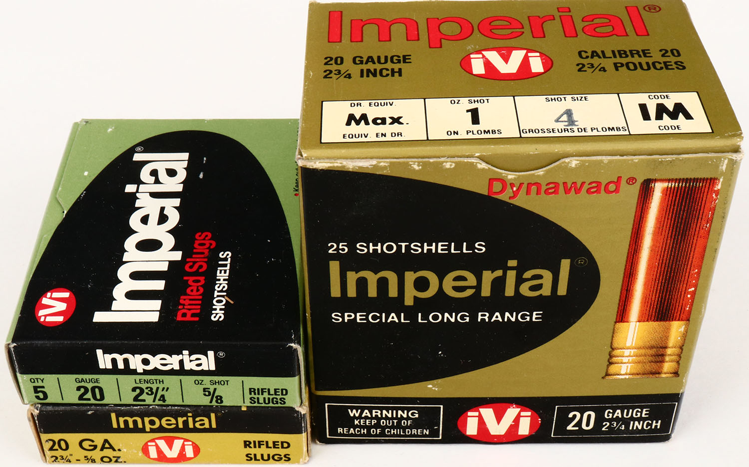 Lot of 3 Imperial, 20ga., 1pc., FULL, shot size Rifled Slugs & 4, boxes are solid, Shells are excellent. Grade: Excellent + - Value: 10 to 30
