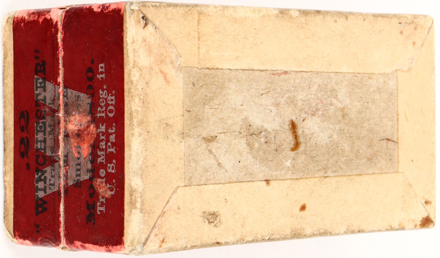 Winchester, .22 W.R.F. Caliber, Smokeless Cartridges, 1906 issue, RR: WRA-152 WRF-13a, Full, 2pc. buff box with purple & black labels, box is solid with good color, 2 seam splits to left end of lid, age soiling, some edge wear, printing on top faded, ammo is very good. Grade: Very Good ++ - Value: 30 to 120
