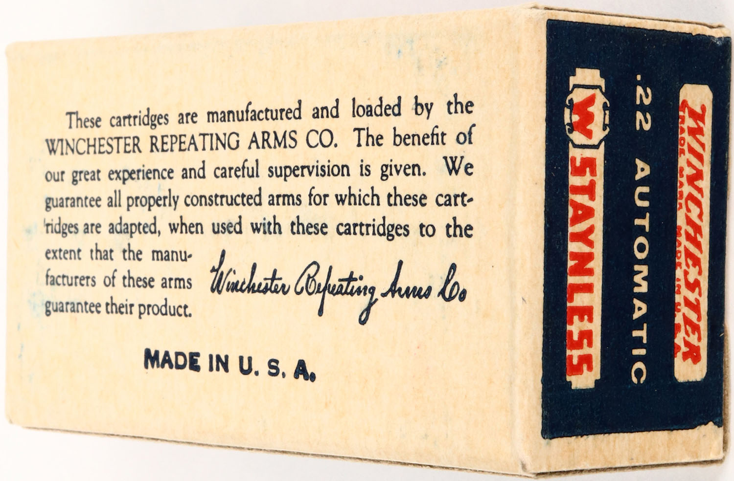 Winchester, Staynless, .22 Automatic, RHWeb: WRA-12B WA-1Bd (unshaded shield), Full, 1pc. Blue white & red box, box is near mint with excellent color, only very minor age soiling, corners are mostly sharp, edges are crisp, end flaps are solid, ammo is minty. Grade: Excellent ++ - Value: 40 to 120
