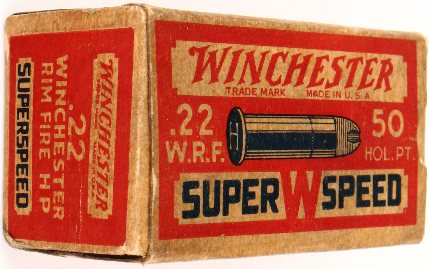 Winchester, Super Speed Staynless, .22 W.R.F., RHWeb: WRA-13 WRF-1a, Full, 1pc. Red buff & blue box, box is solid with very good color, age soiling, very minor corner wear, edges are mostly crisp, ammo is very good to excellent. Grade: Very Good ++ - Value: 20 to 100