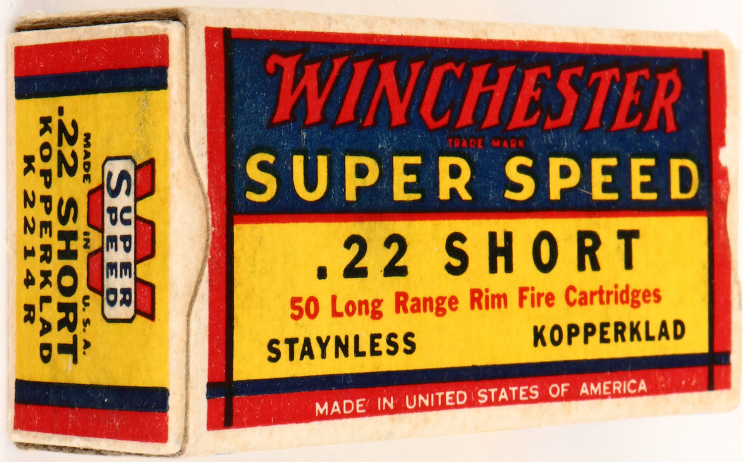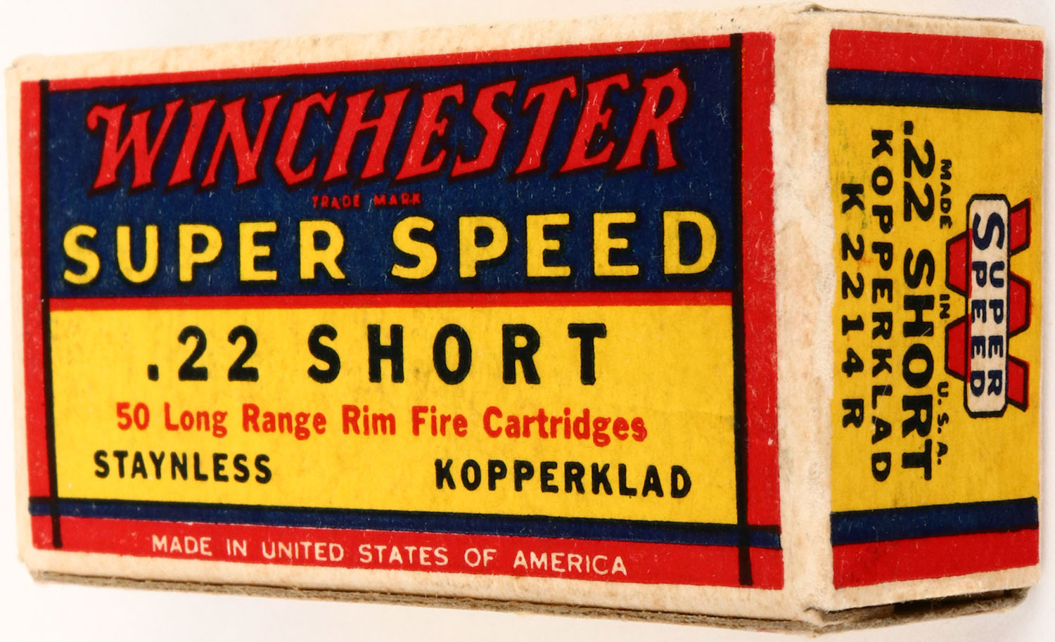 Winchester, Super Speed, .22 Short, Staynless Kopperklad, RHWeb: WRA-15 S-1b, Full, 1pc. Yellow red & blue box, box is solid with excellent color, very minor age soiling, corners are mostly sharp, edges are crisp, end flaps are solid, ammo is excellent. Grade: Excellent ++ - Value: 10 to 50