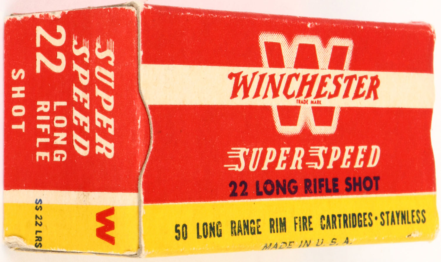 Winchester, Super Speed, .22 Long Rifle Shot, RHWeb: WRA-17 LR-5d, Full, 1pc. Red yellow & white box, box is solid with excellent color, very minor corner wear, edges are crisp, end flaps are rigid, ammo is excellent. Grade: Excellent ++ - Value: 8 to 40