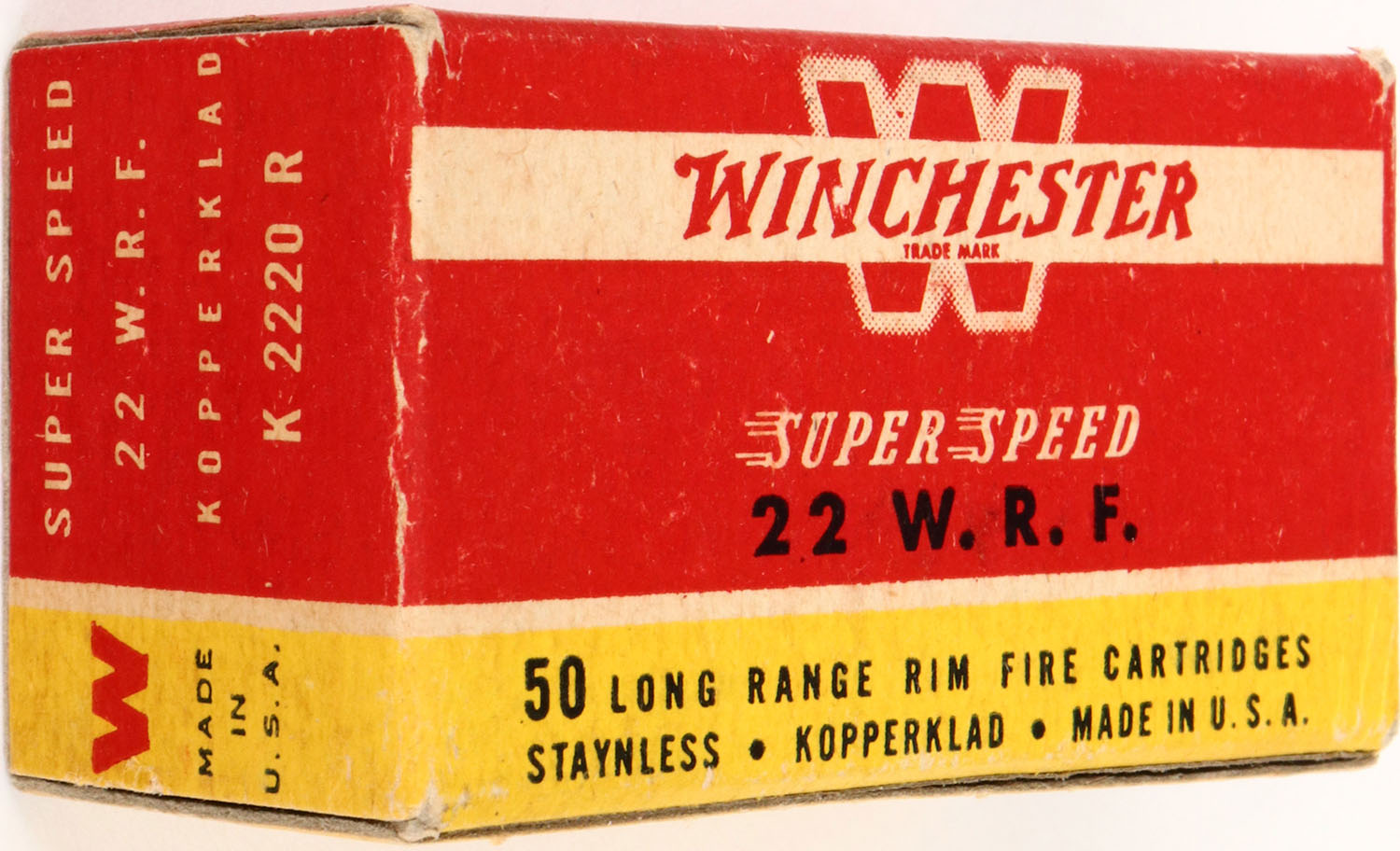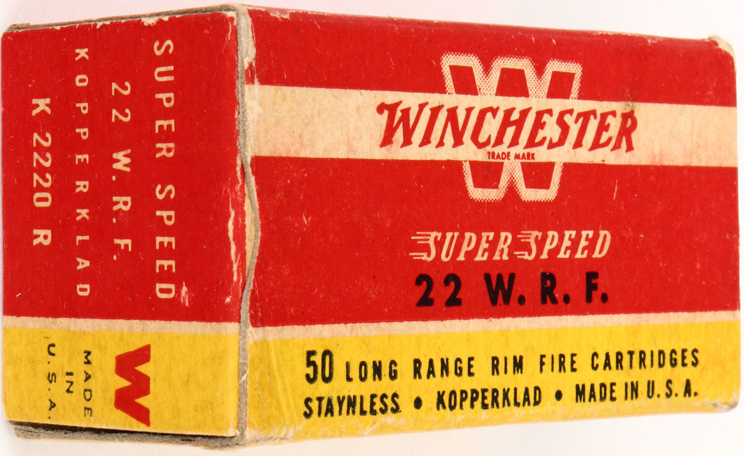 Winchester, .22 W.R.F., Staynless - KopperKlad, RHWeb: WRA-17 WRF-1a (nickel washed cases), Full, 1pc. Red yellow & white box, box is solid with excellent color, very minor age soiling & corner wear, edges are crisp, end flaps are rigid, ammo is excellent. Grade: Excellent + - Value: 10 to 50
