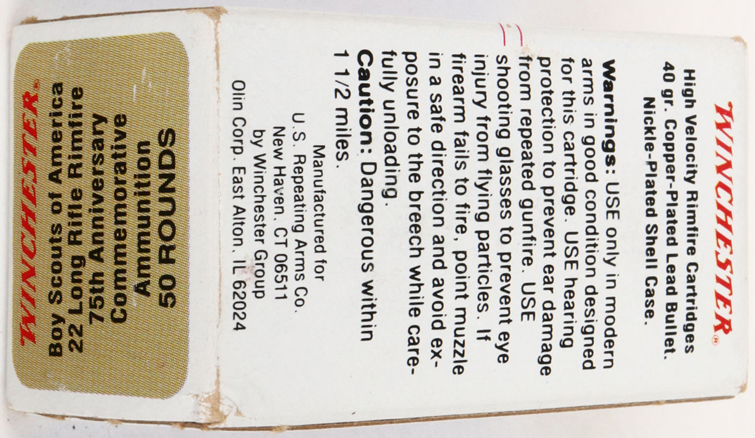 Winchester, Boy Scouts of America 75th Anniversary, .22 Long Rifle, RHWeb: WRA-70 LR-1, Full, 1pc. Multicolored box, box is mint with minty color, sharp corners, crisp edges, rigid end flaps, ammo is minty. Grade: Mint - Value: 10 to 50