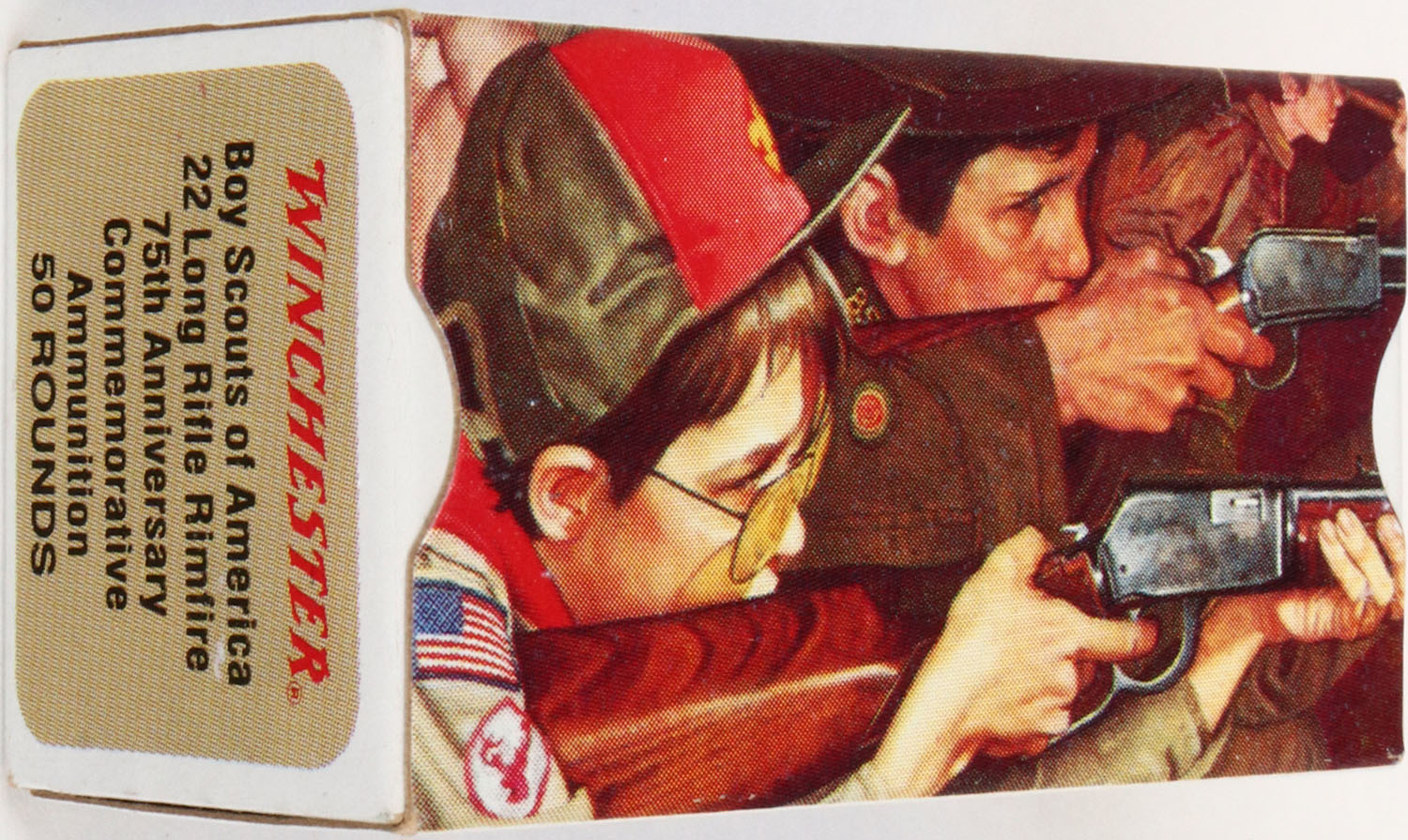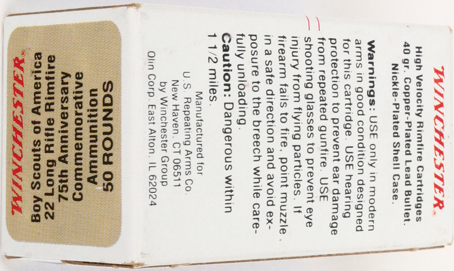 Winchester, Boy Scouts of America 75th Anniversary, .22 Long Rifle, RHWeb: WRA-70 LR-1, Full, 1pc. Multicolored box, box is mint with minty color, sharp corners, crisp edges, rigid end flaps, ammo is minty. Grade: Mint - Value: 10 to 50