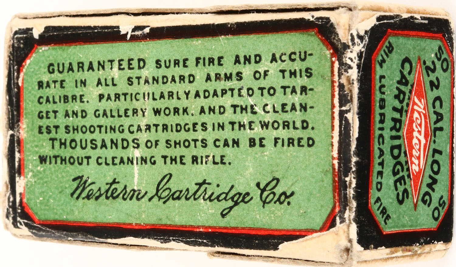 Western, .22 Long, Lubricated, RHWeb: WCC-2 L-2, Full, 2pc. Buff box with green blue & red wraparound label, box is solid with excellent color, very minor age soiling, some edge wear, small stain to front of box, very minor corner wear, labels are intact, ammo is very good. Grade: Excellent - Value: 20 to 80