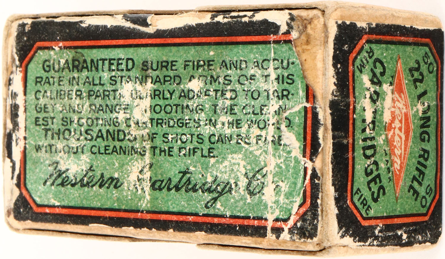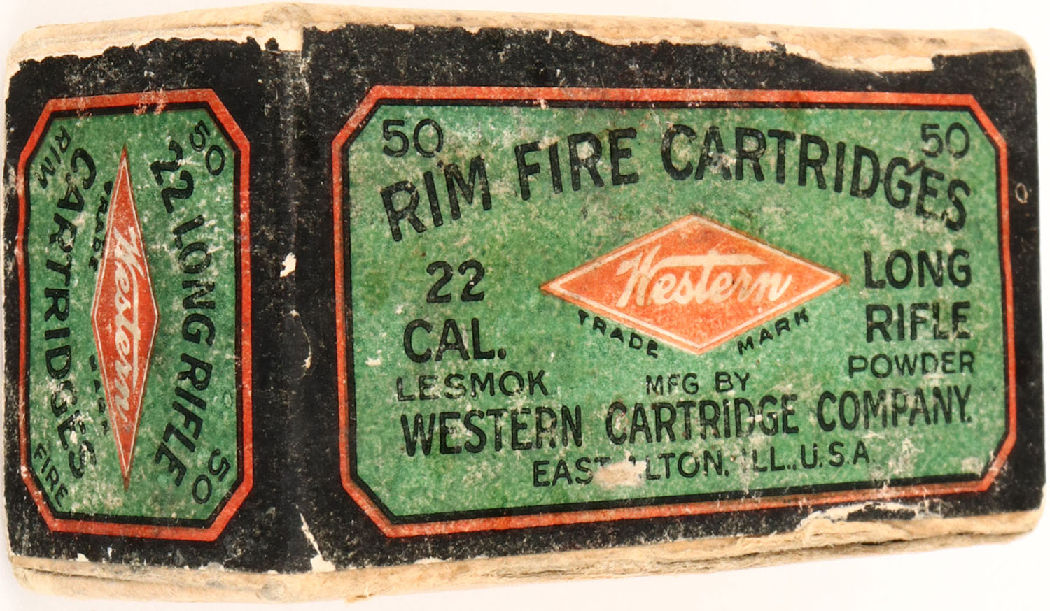 Western, .22 Long Rifle, Lesmok, RHWeb: WCC-3 LR-8, Full, 2pc. Buff box with green blue & red wraparound label, box is solid with very good to excellent color, very minor age soiling & color fading, very minor edge & corner wear, ammo is excellent. Grade: Very Good ++ - Value: 20 to 100