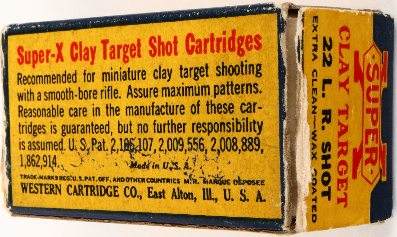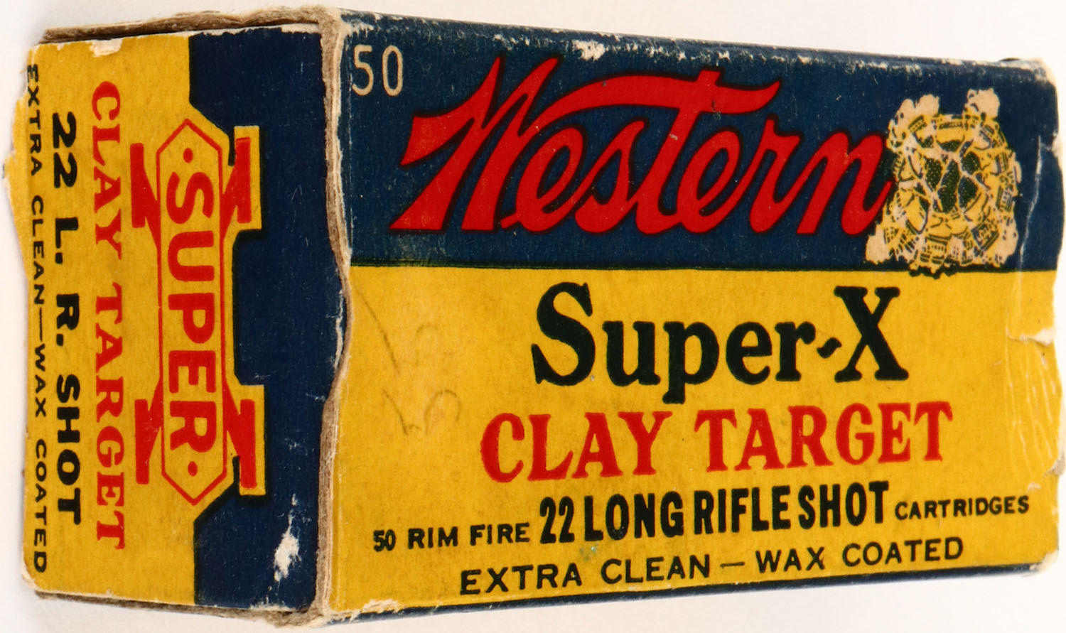 Western, Super-X Clay Target, .22 Long Rifle Shot, RHWeb: (Super-X Long Rifle) WCC-44 LRS-10, Full, 1pc Yellow blue & red box, box has very good to excellent color, right end flap is torn, very minor age soiling, minor corner & edge wear, top has been written on, left end flap is fairly rigid, ammo is excellent. Grade: Very Good ++ - Value: 4 to 20