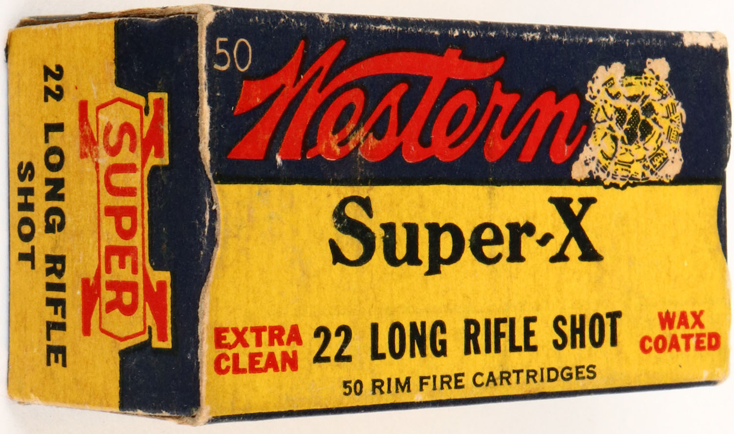 Western, Super-X, .22 Long Rifle Shot, Extra Clean Wax Coated, RHWeb: WCC-47 LRS-16, Full, 1pc. Yellow blue & red box, box is solid with excellent color, some edge wear, ammo is excellent. Grade: Excellent ++ - Value: 8 to 40