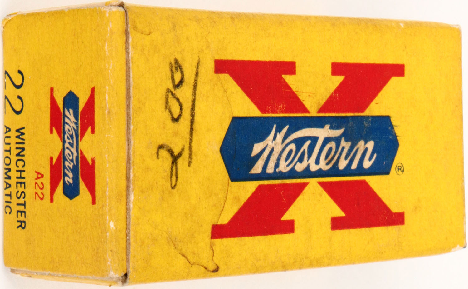Western, X, .22 Winchester Automatic, A22, RHWeb: WCC-11 WA-1b, Full, 1pc. Yellow red & blue box, box is solid with very good color, some age soiling, very minor corner wear, edges are mostly crisp, top has been written on, Tennessee ammo tax stamp on bottom, end flaps are solid, ammo is excellent. Grade: Excellent + - Value: 20 to 60