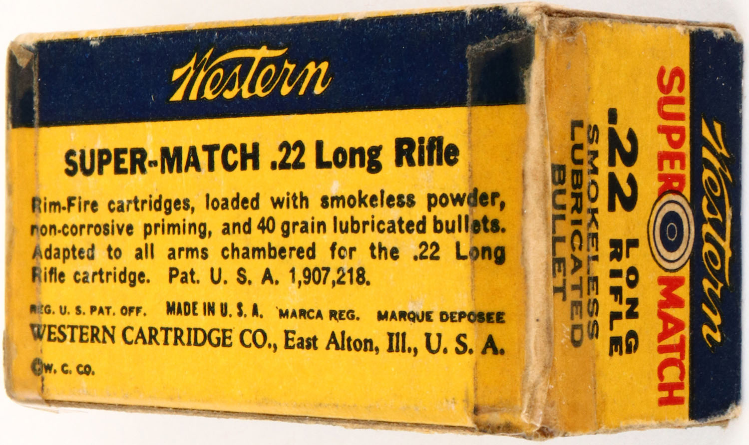 Western, Super Match, .22 Long Rifle, RHWeb: WCC-51.1 LR-2a, Full, 1pc. Yellow blue & red box, box has excellent color, both end flaps are torn, left end flap is missing tab,, minor corner wear, edges are crisp, ammo is excellent. Grade: Very Good + - Value: 2 to 20