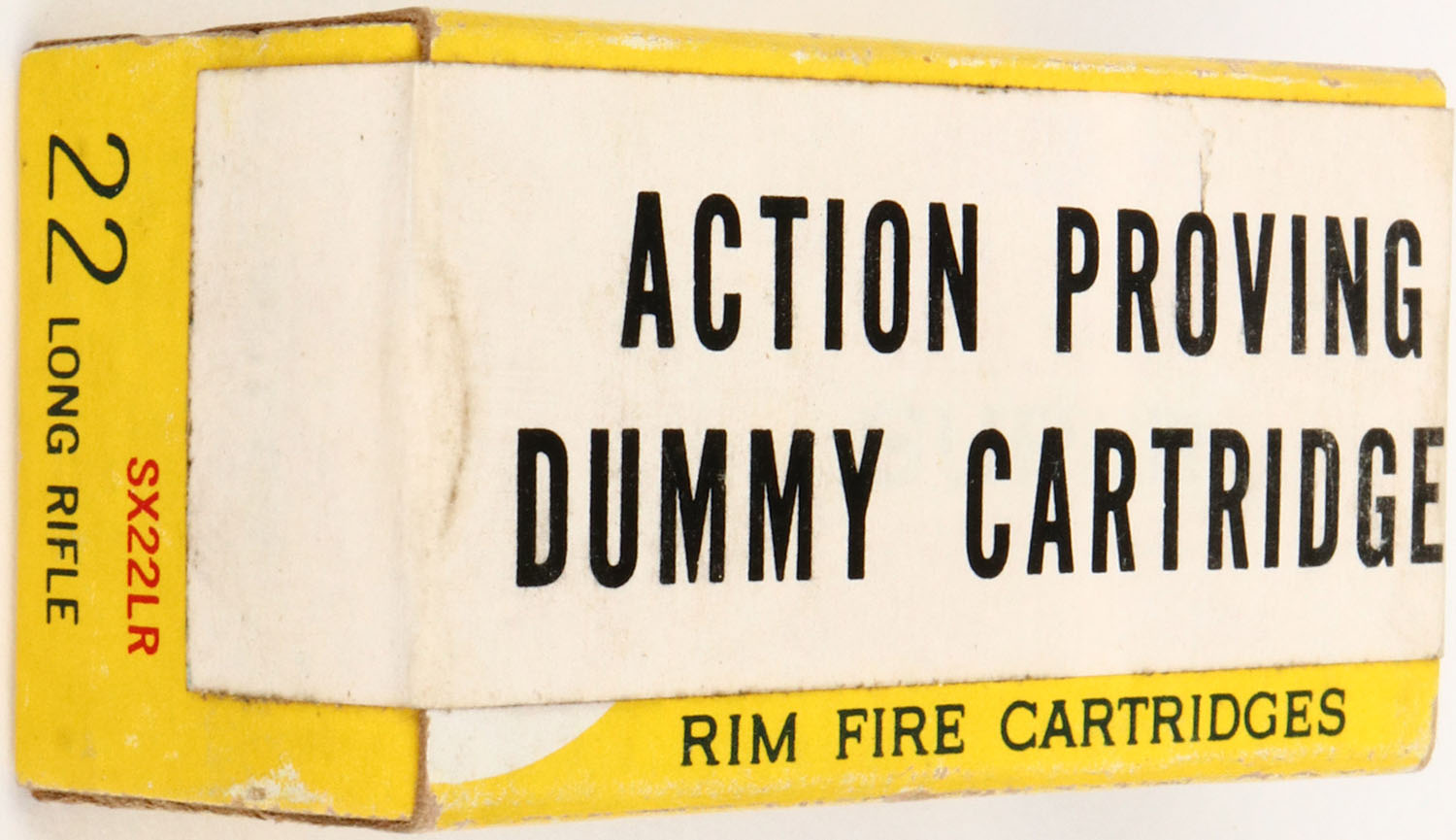 Western, Super X, .22 Long Rifle Action Proving Dummy Cartridges, RHWeb: WCC-12 LR-6, FULL & SEALED, 1pc. Yellow white & red box with white over label, box is solid with excellent color, very minor edge & corner wear. Grade: Excellent ++ - Value: 6 to 30