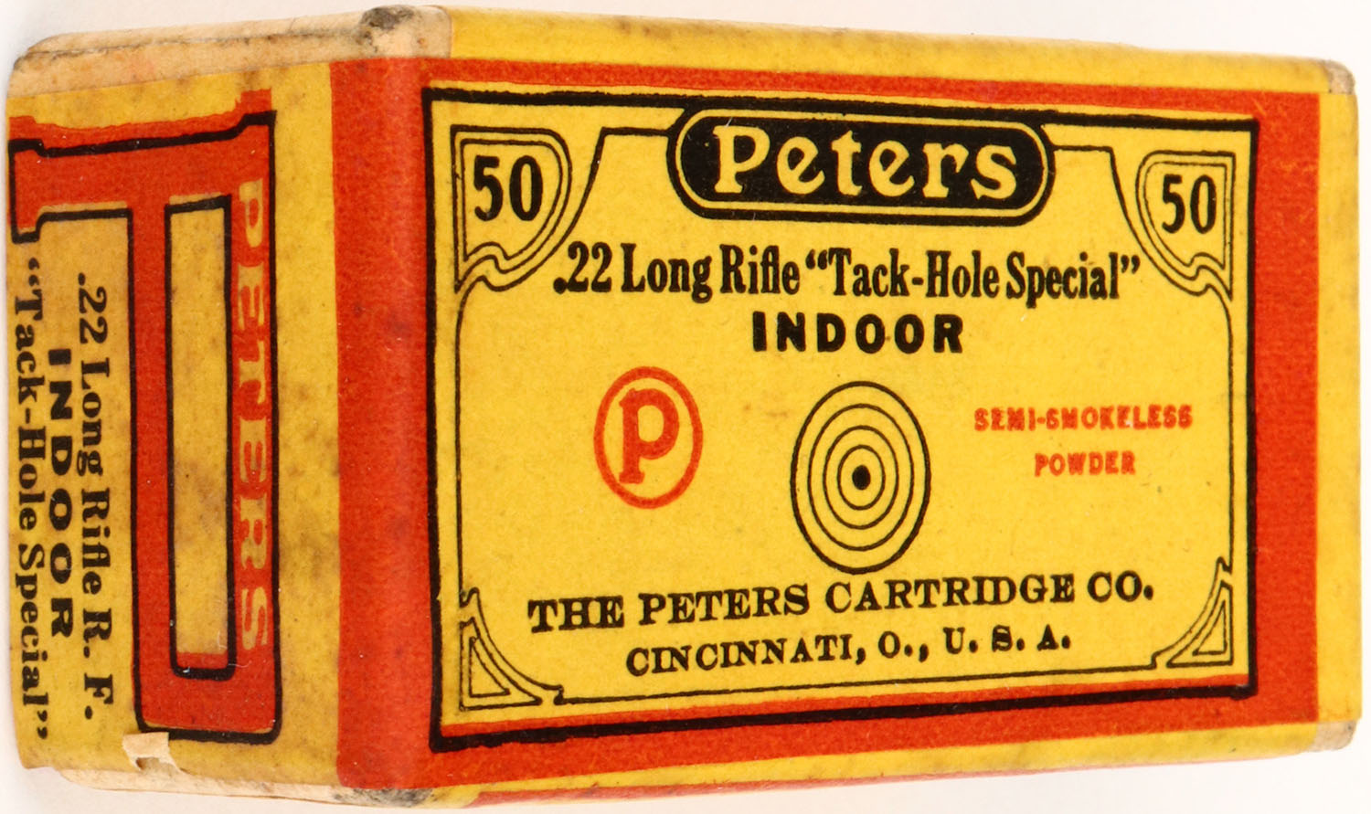 Peters, .22 Long Rifle ''Tack-Hole Special'' Indoor, Semi-Smokeless Powder, RHWeb: PCC-52 LR-5, FULL & SEALED, 2pc. Buff box with yellow & red wraparound side & end label, box is solid with excellent color, some age soiling, very minor corner wear, edges are crisp. Grade: Excellent ++ - Value: 100 to 400