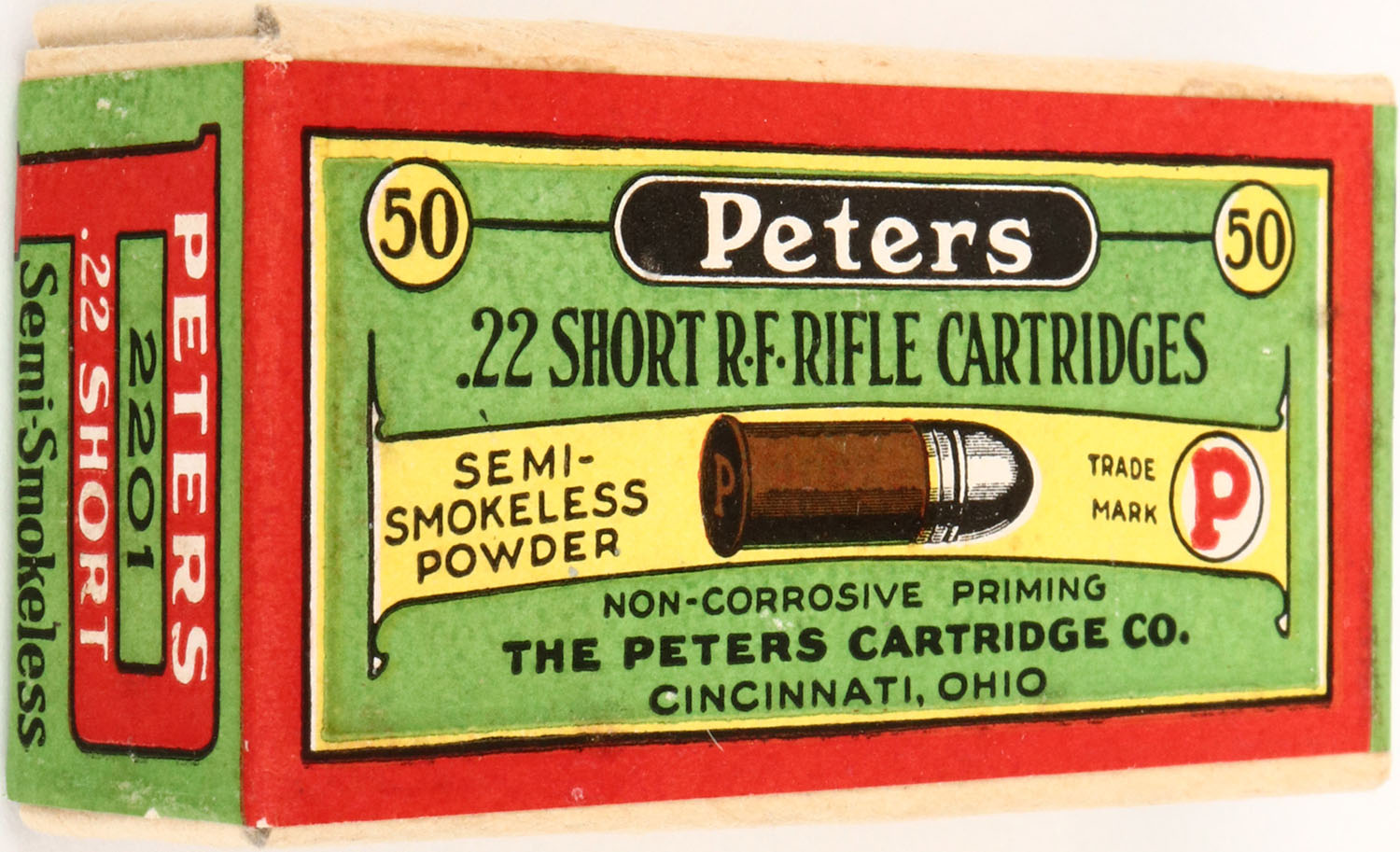 Peters, .22 Short, Semi-Smokeless Powder, RHWeb: PCC-5B S-1c, Full & Sealed, 2pc. Buff box with green & red wraparound label, box is mint with mint color, corners are very sharp, edges are crisp. Grade: Mint - Value: 40 to 120