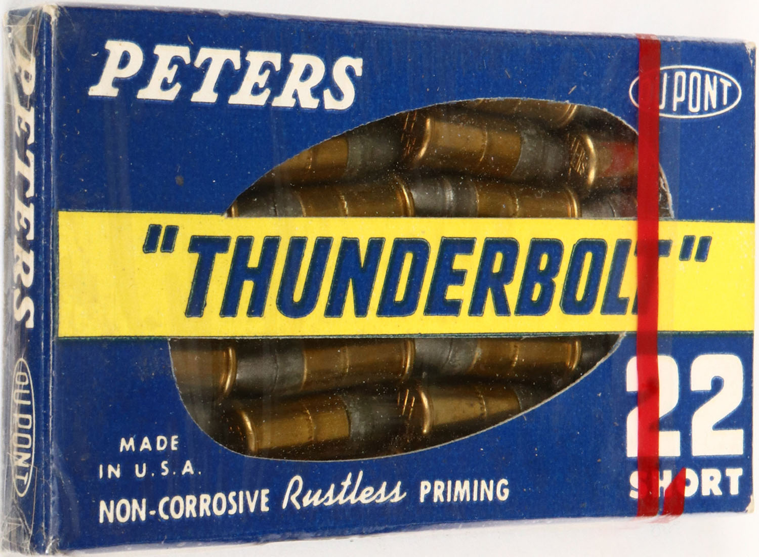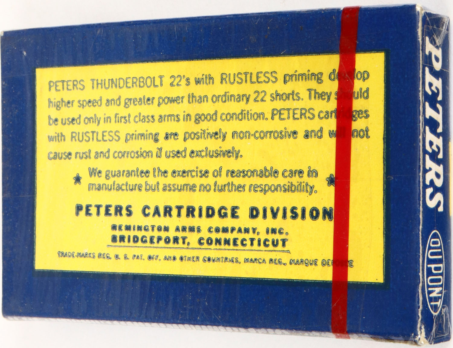 Peters, ''Thunderbolt'', .22 Short, Non-Corrosive Rustless Priming, RHWeb: PCC-17 S-5, Full & Sealed, 1pc. Blue & yellow box, box is mint. Grade: Mint - Value: 30 to 90