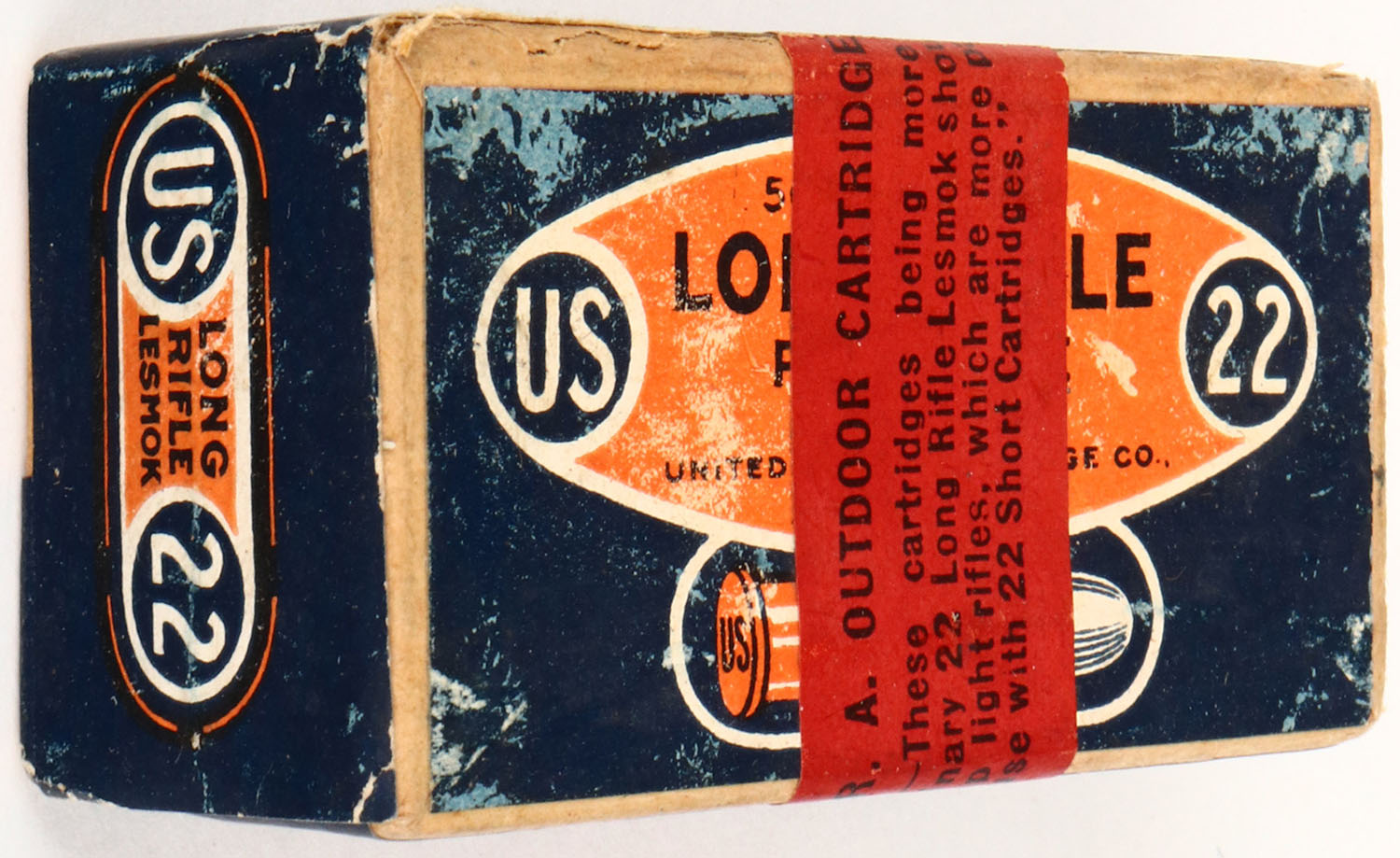 U.S., .22 Long Rifle, Target Issue, Lesmok, RHWeb: US-51 LR-1, FULL & SEALED, 2pc. Blue & orange box with red overlabel, box is solid with excellent color, minor shelf wear, edges are crisp, corners are sharp, labels are intact. Grade: Very Good ++ - Value: 10 to 100