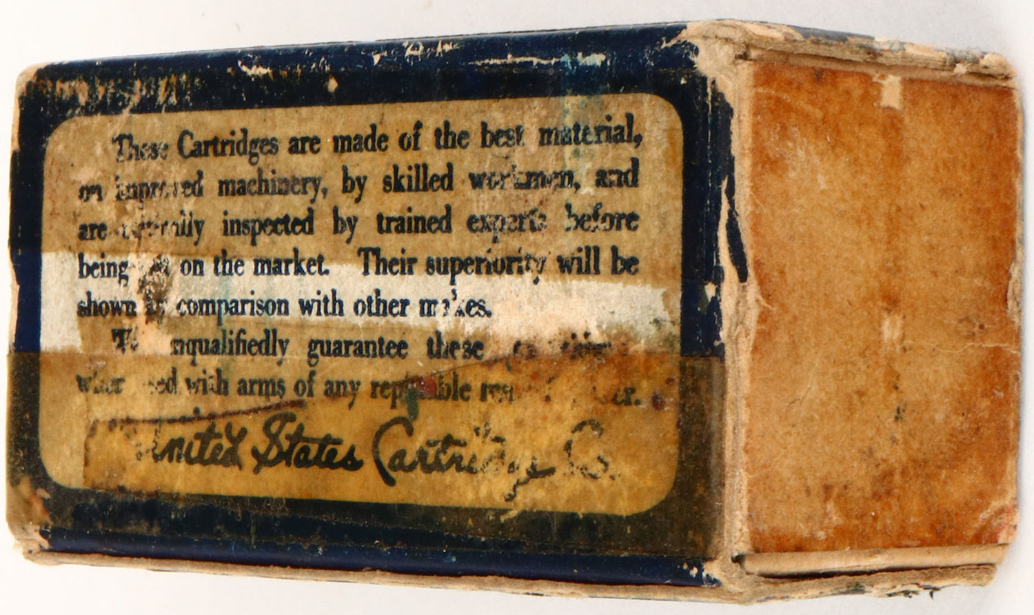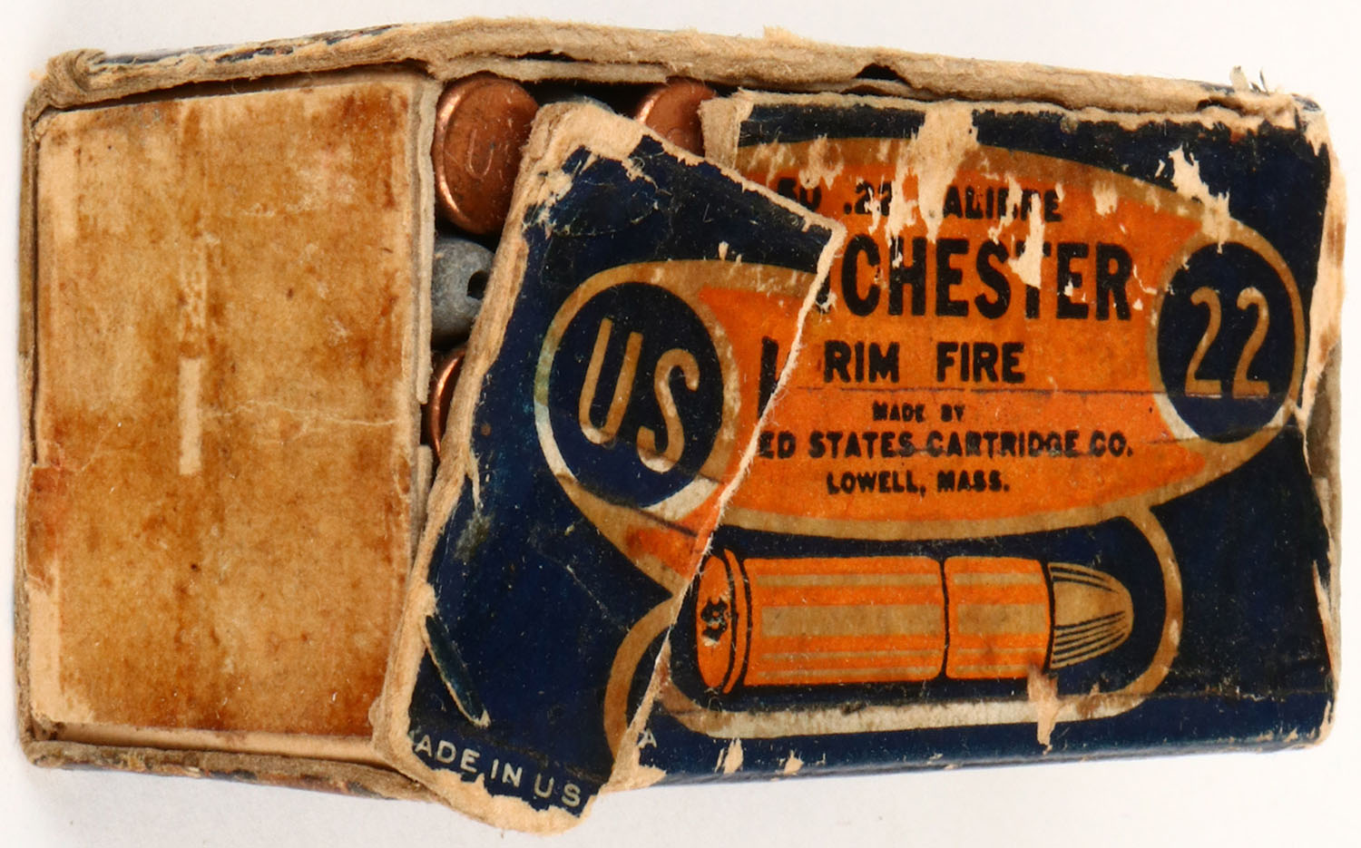U.S., .22 W.R.F. Hollow Point, Lesmok, RHWeb: US-8 WRF-2, Full, 1pc. Blue & orange box, box is missing both end flaps, near complete seam split on top back edge, scuffing, age soiling, edge & corner wear, ammo is very good to excellent. Grade: Very Good - Value: 6 to 60