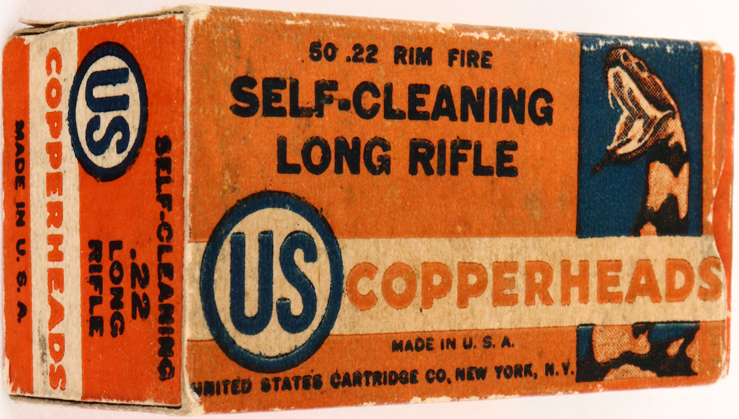 U.S., Copperheads, .22 Long Rifle, RHWeb: US-12 LR-12b, Full, 1pc. Orange white & blue box, box is solid with very good to excellent color, minor age soiling and color fading, very minor corner wear, edges are mostly crisp, end flaps are rigid, ammo is excellent. Grade: Excellent + - Value: 30 to 90