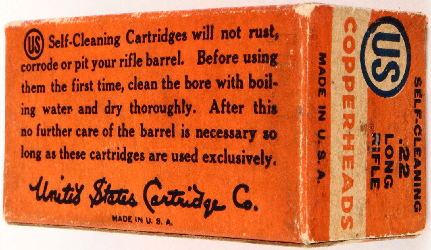U.S., Copperheads, .22 Long Rifle, Self-Cleaning, RHWeb: US-12 LR-1b, Full, 1pc. Orange white & blue box, box is solid with excellent color, minor age soiling, very minor edge & corner wear, end flaps are solid, ammo is excellent. Grade: Excellent + - Value: 30 to 90