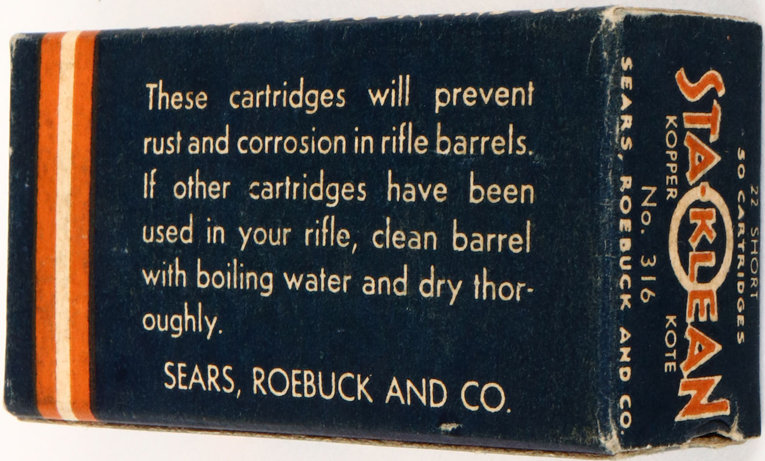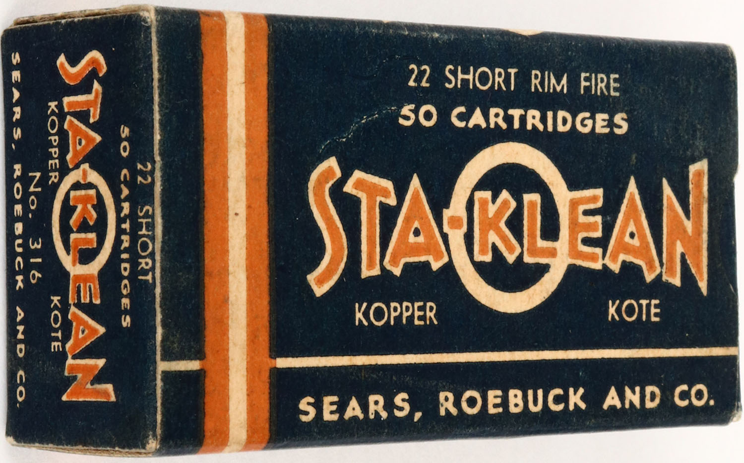 Sears, Sta-Klean, .22 Short, Kopper Kote, RHWeb: SEARS-5 S-3a, Full, 1pc. Blue & orange box, box is solid with very good color, some age soiling, corners are mostly sharp, edges are crisp, end flaps are solid, ammo is excellent. Grade: Excellent ++ - Value: 8 to 40