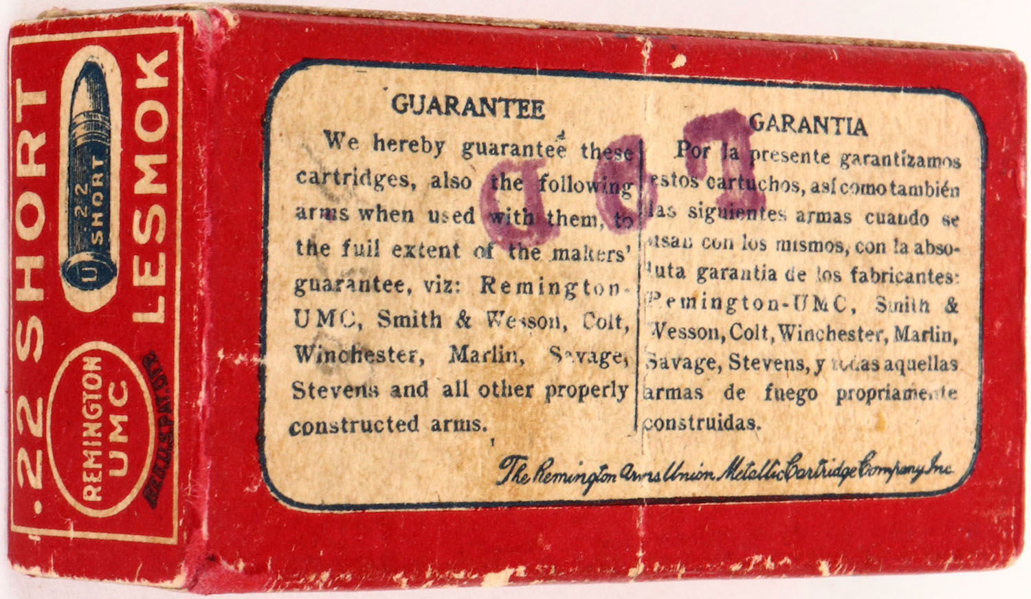REM-UMC, .22 Short, Lesmok, RHWeb: REM-4 S-2B, Full, 1pc. Red & black box, box is solid with excellent color, very minor edge & corner wear, end flaps are solid, ammo is excellent. Grade: Excellent ++ - Value: 10 to 50