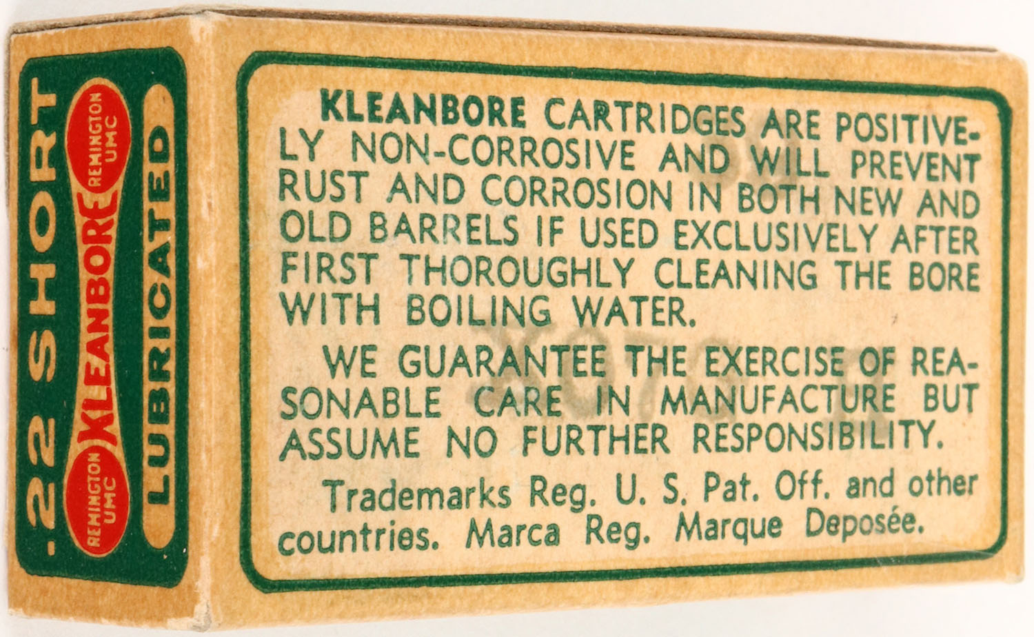 Remington, Kleanbore, .22 Short, RHWeb: REM-7.2 S-1b, Full, 1pc. Green & white dog bone box, box is near mint with excellent to minty color, only very minor age soiling, corners are sharp, edges are crisp, end flaps are rigid, ammo is excellent. Grade: Excellent ++ - Value: 10 to 50