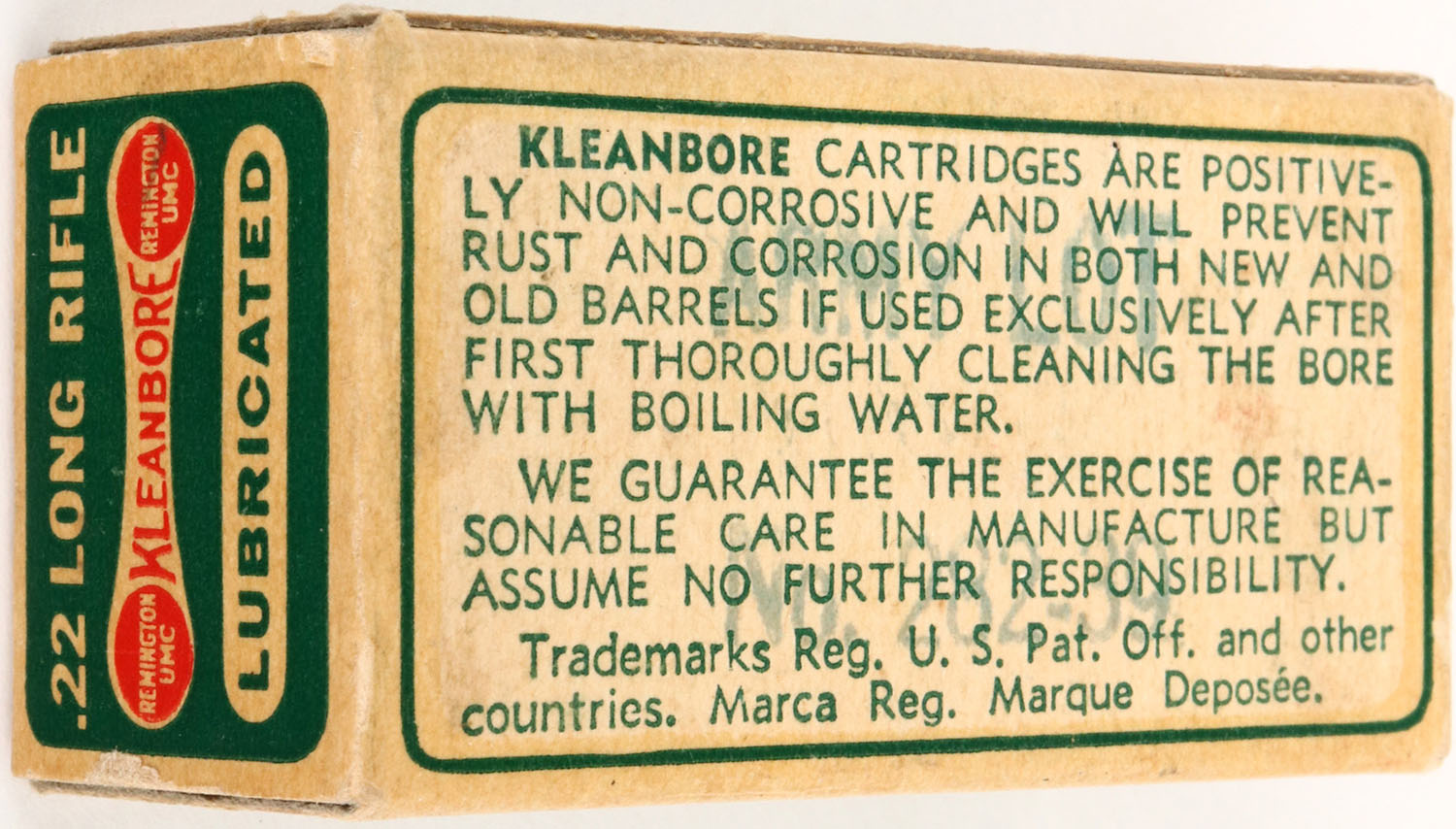 Remington, Kleanbore, .22 Long Rifle, RHWeb: REM-7.2 LR-1e, Full, 1pc. Green & buff dog bone box, box is solid with excellent color, very minor age soiling & corner wear, edges are crisp, end flaps are solid, ammo is excellent. Grade: Excellent ++ - Value: 8 to 40