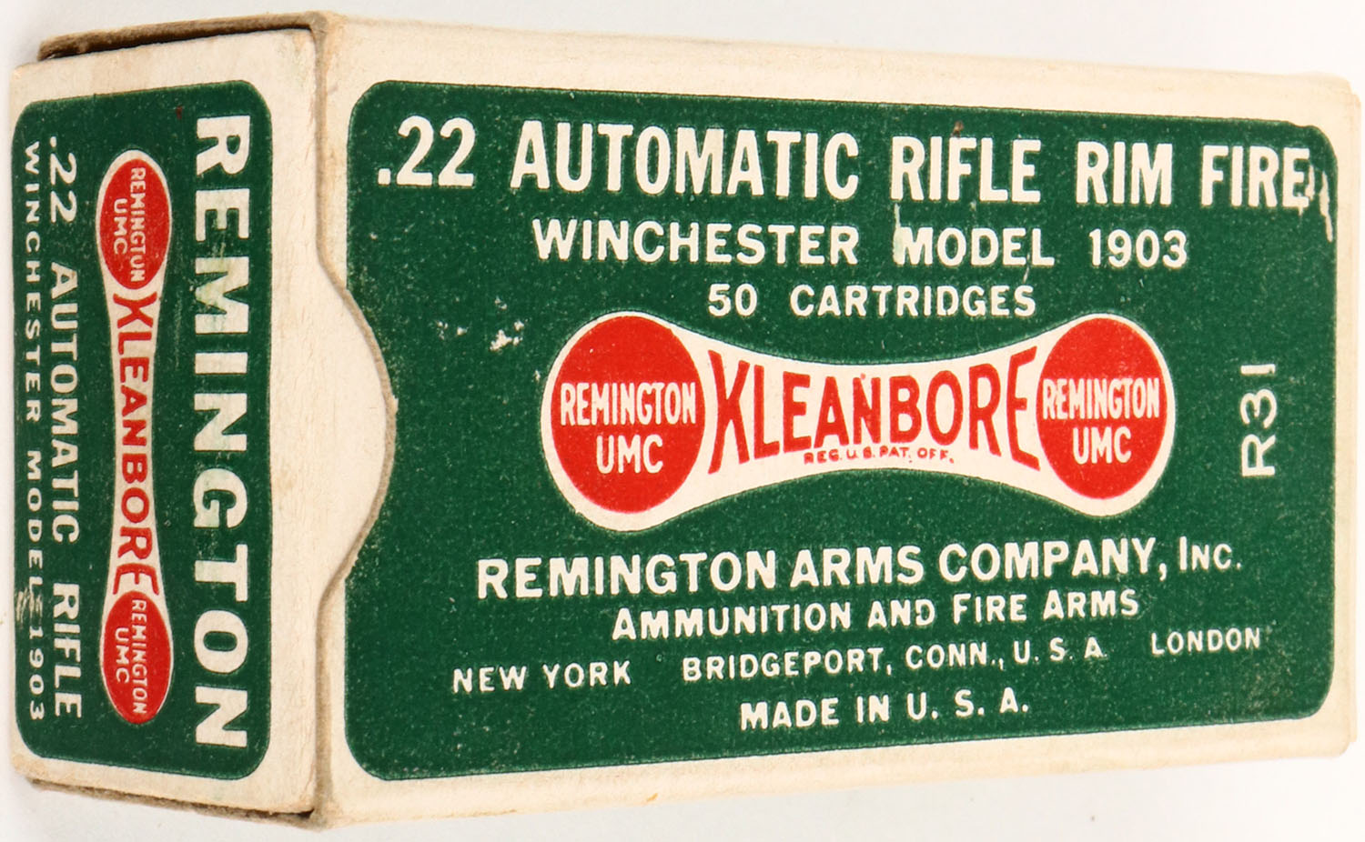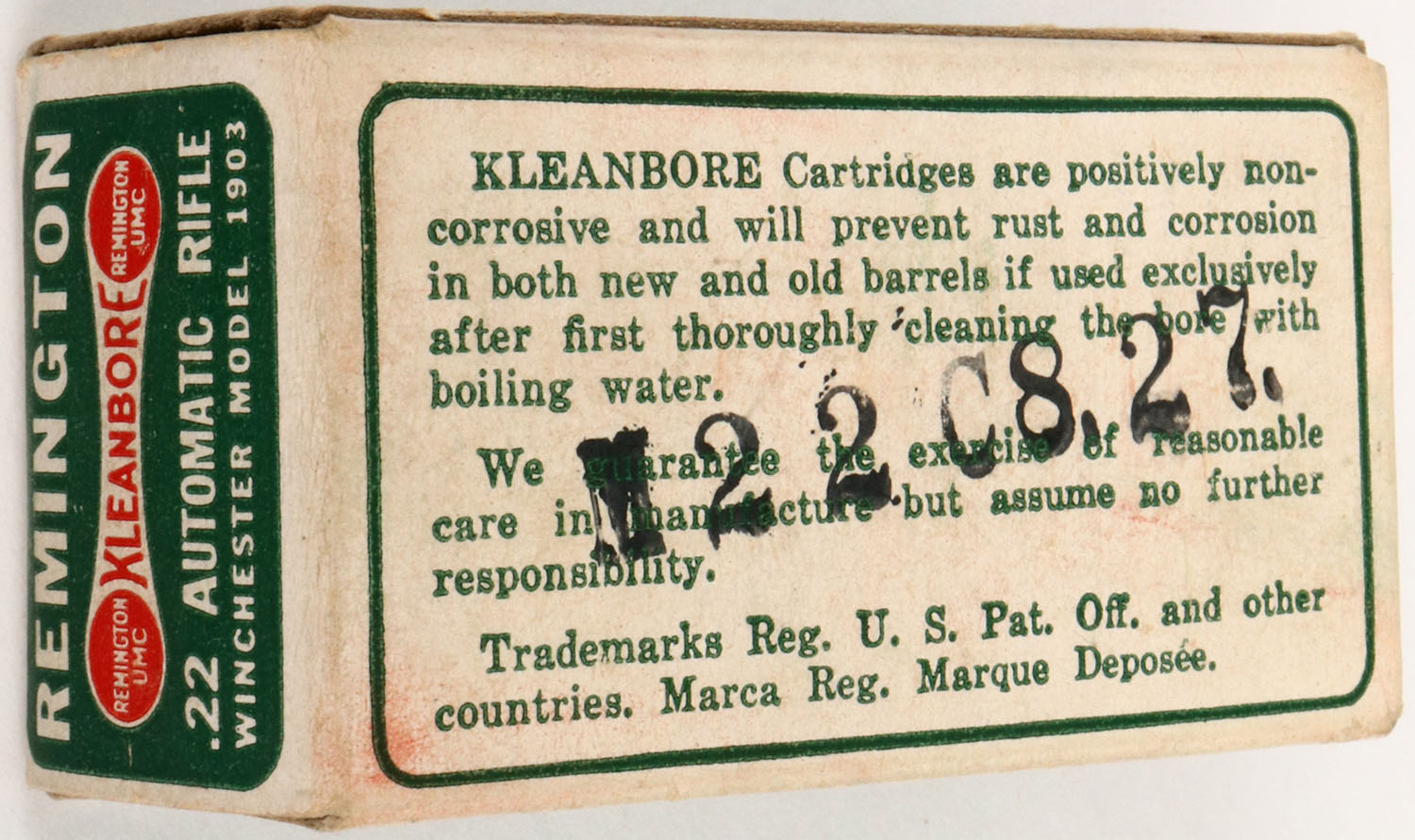 Remington, Kleanbore, .22 Automatic, RHWeb: REM-7.1B WA-1h, Full, 1pc. Green & white box, box is solid with minty colors, very minor shelf & corner wear, edges are crisp, end flaps are solid, ammo is excellent to minty. Grade: Excellent ++ - Value: 10 to 50