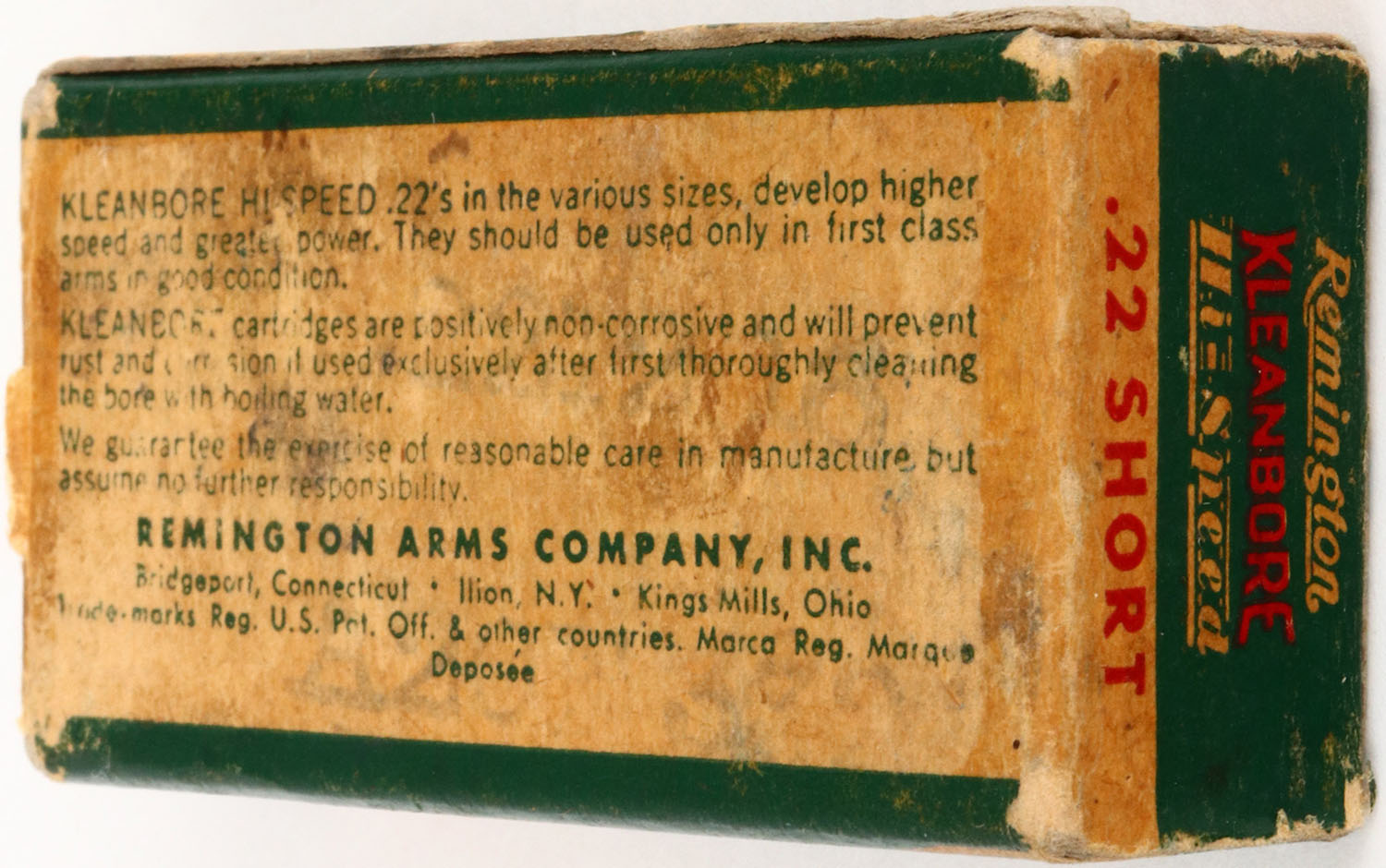 Remington, .22 Short, Kleanbore Hi-Speed, Non-Corrosive Non-Erosive, RHWeb: REM-10 S-1b, Full, 1pc. Green white & red box, box is solid with good color, some age soiling & edge wear, minor scuffing throughout, ammo is very good. Grade: Excellent - Value: 6 to 30