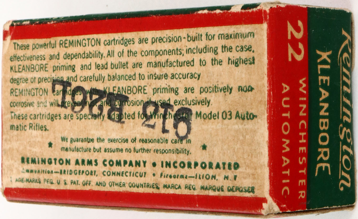 Remington, Kleanbore, .22 Winchester Automatic, 7522, RHWeb: REM-12 WA-1a, Full, 1pc. Green red & white box, box is solid with excellent color, very minor age soiling, some edge & corner wear, end flaps are solid, ammo is excellent to minty. Grade: Excellent ++ - Value: 10 to 50
