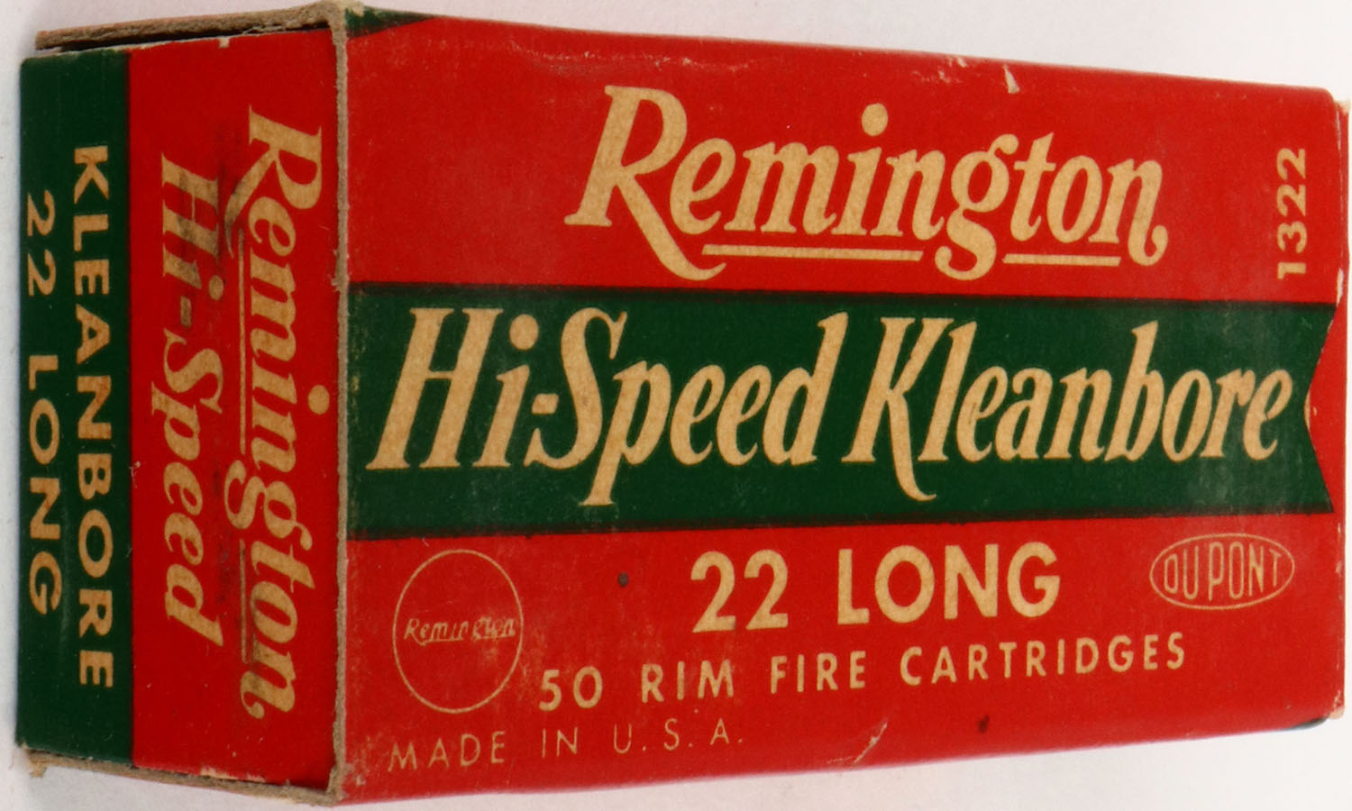 Remington, Hi-Speed Kleanbore, .22 Long, RHWeb: REM-14 L-1b, Full, 1pc. Red & green box, box is solid with excellent color, minor age soiling, very minor corner wear, edges are crisp, end flaps are solid, ammo is excellent. Grade: Excellent ++ - Value: 4 to 20