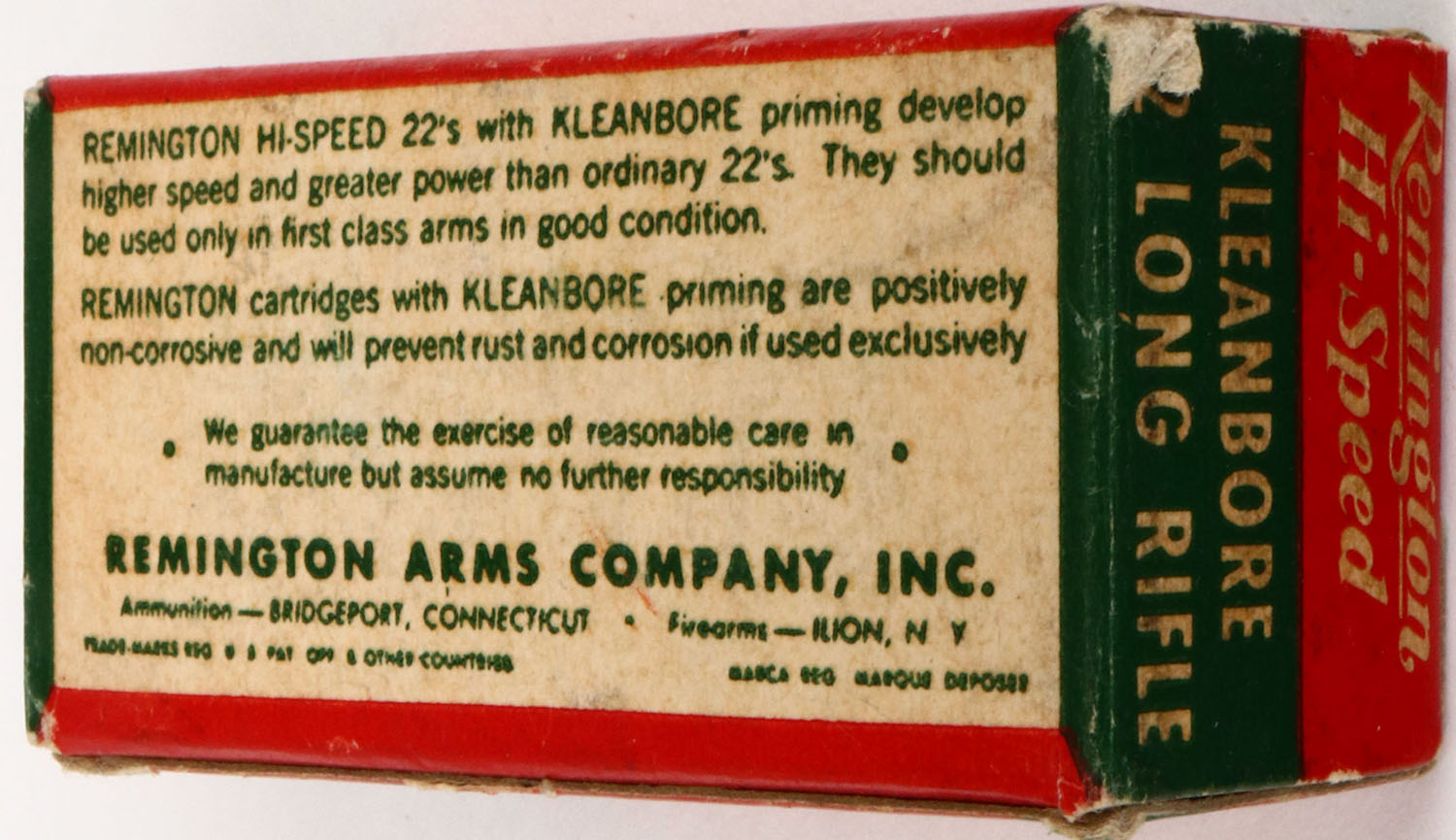 Remington, Hi-Speed Kleanbore, .22 Long Rifle, RHWeb: REM-14 LR-1, Full, 1pc. Red green & white box, box is solid with excellent color, minor age soiling, very minor edge & corner wear, end flaps are solid, ammo is excellent. Grade: Excellent ++ - Value: 4 to 20