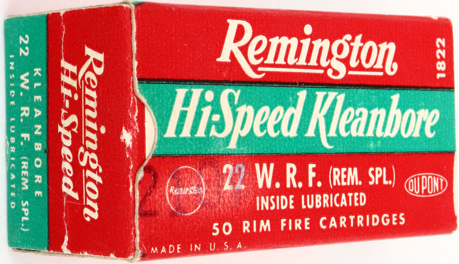 Remington, .22 W.R.F. (Rem. Spl.), Hi-Speed, Inside Lubricated, Non-Corrosive Kleanbore Priming, RHWeb: REM-14 WRF-1.5c, Full, 1pc. Red green & white box, box is solid with excellent color, very minor edge wear on ends, edges are crisp, ammo is minty. Grade: Excellent ++ - Value: 10 to 50