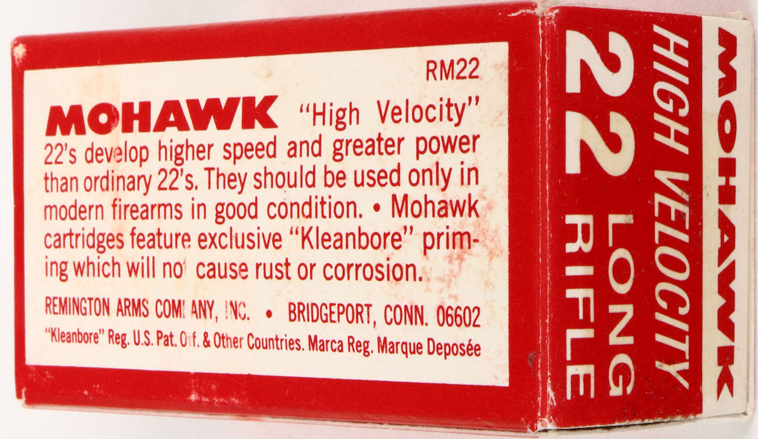 Remington, Mohawk, .22 Long Rifle, High Velocity, RHWeb: REM-30 LR-1, Full, 1pc. Red & white box, box is solid with excellent color, some shelf wear, scuff to left end, some shelf wear, very minor corner wear, edges are crisp, end flaps are solid, ammo is excellent. Grade: Excellent + - Value: 6 to 30