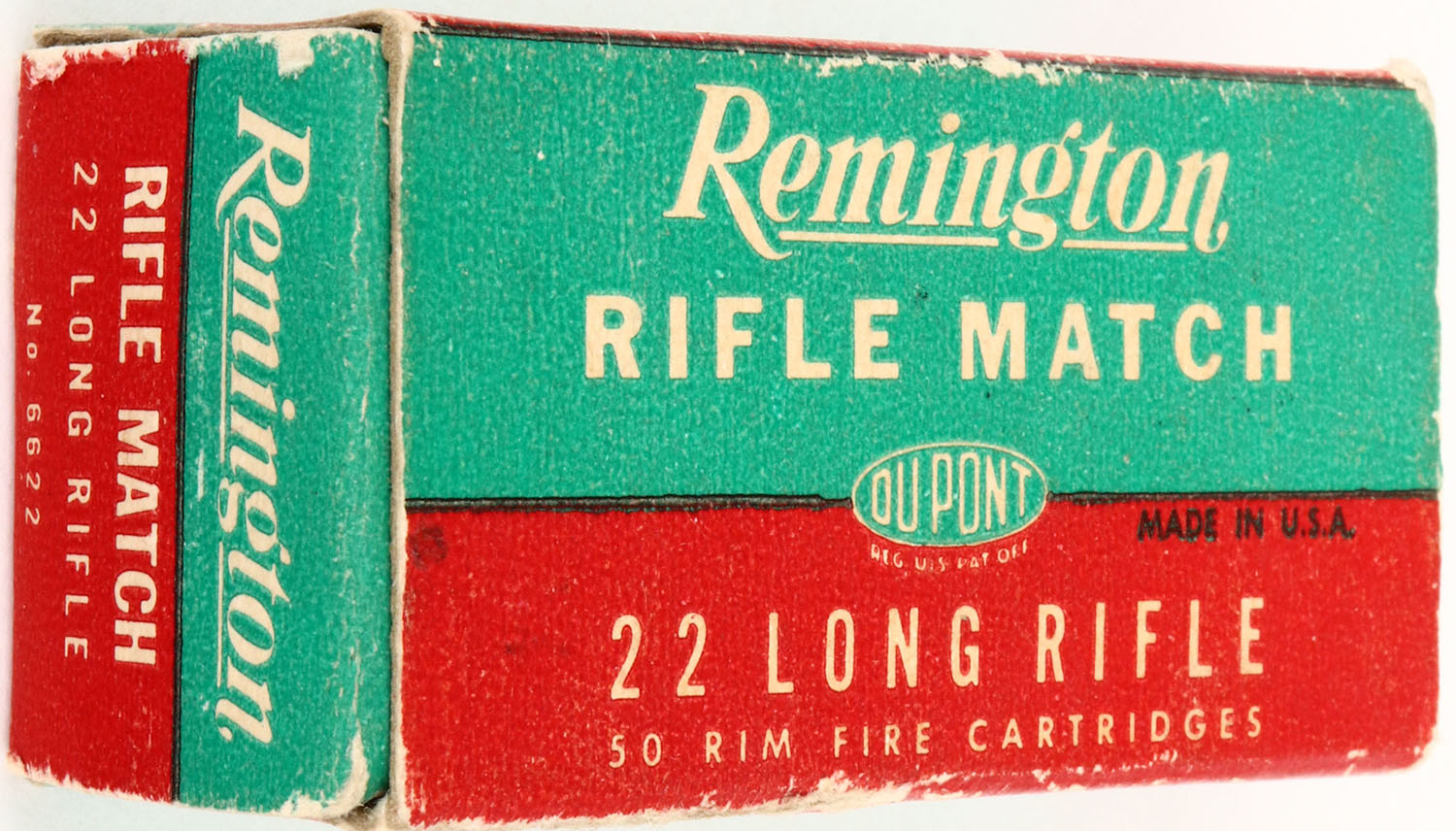Remington, Rifle Match, .22 Long Rifle, Kleanbore, RHWeb: REM-54 LR-3c, Full, 1pc. Green red & white box, box is solid with excellent color, minor age soiling & edge wear, very minor corner wear, end flaps are rigid, ammo is excellent. Grade: Excellent + - Value: 6 to 30