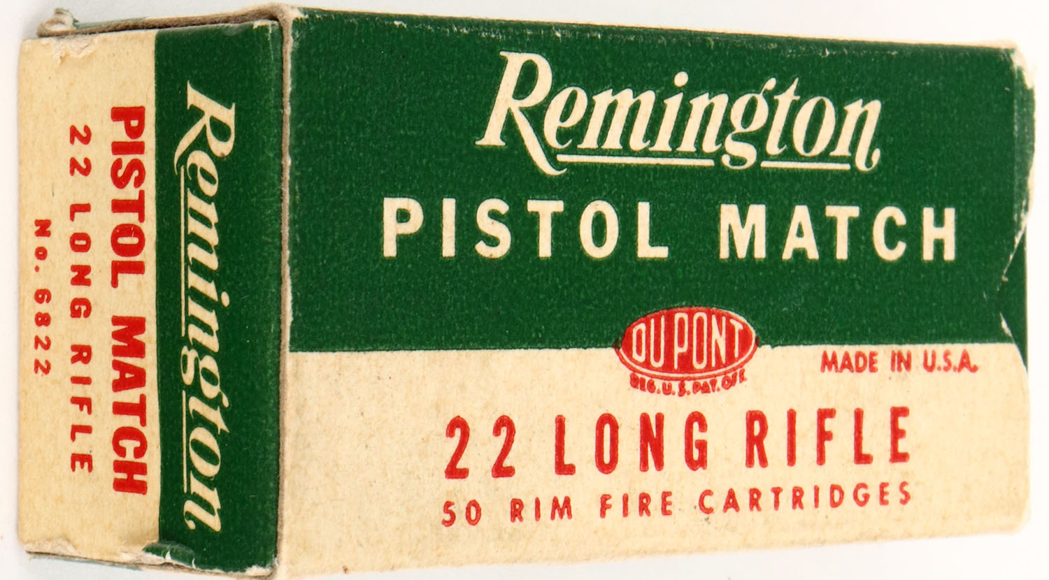 Remington, Pistol Match, .22 Long Rifle, RHWeb: REM-54 LR-4a, Full, 1pc. White & green box, box is solid with excellent color, some age soiling, minor edge & corner wear, end flaps are solid, ammo is excellent. Grade: Excellent + - Value: 4 to 20