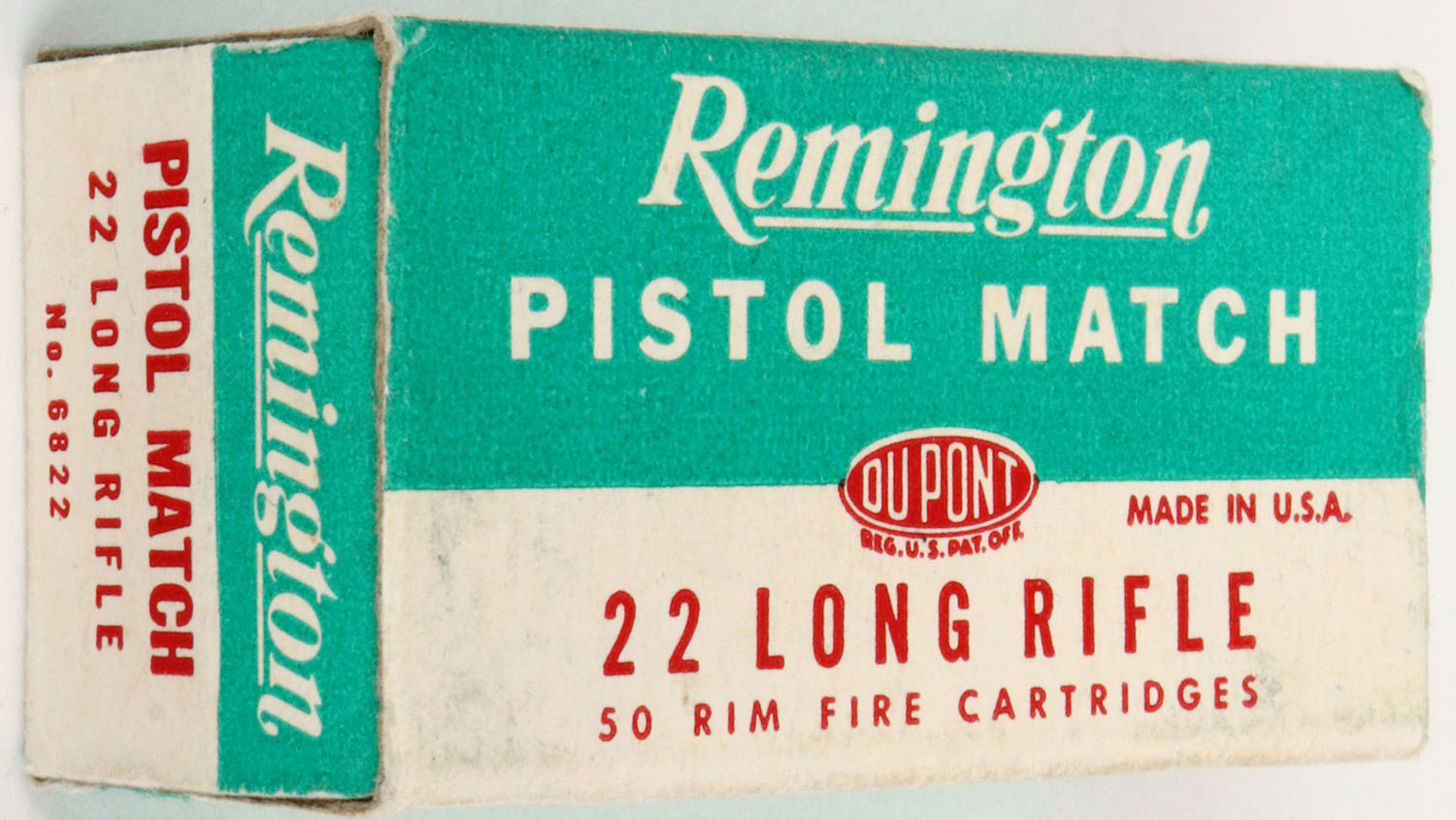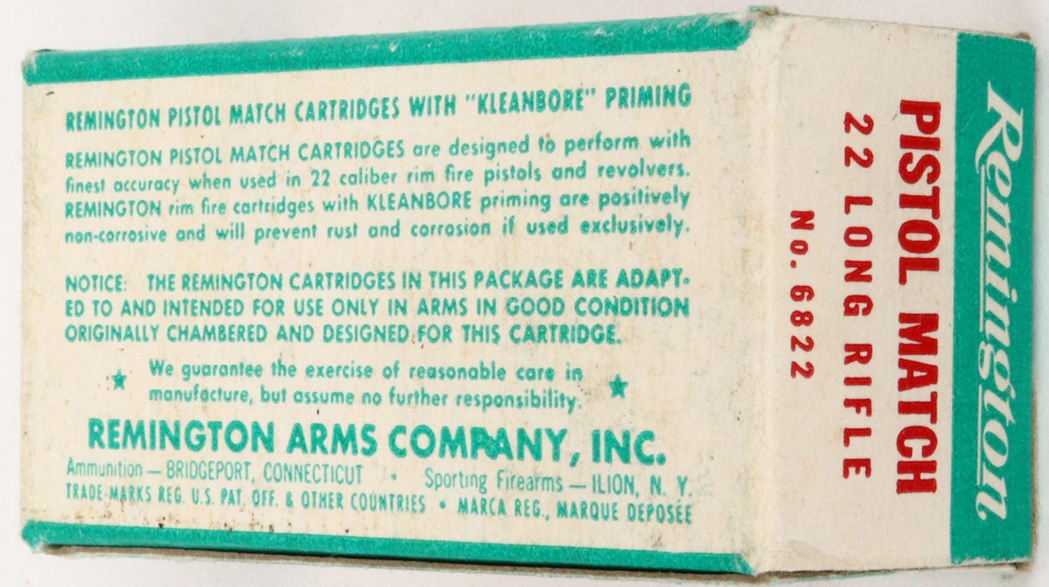 Remington, Pistol Match, .22 Long Rifle, RHWeb: REM-54 LR-4b, Full, 1pc. Green & white box, box is solid with excellent color, very minor corner wear, edges are mostly crisp, end flaps are solid, ammo is excellent. Grade: Excellent ++ - Value: 4 to 20