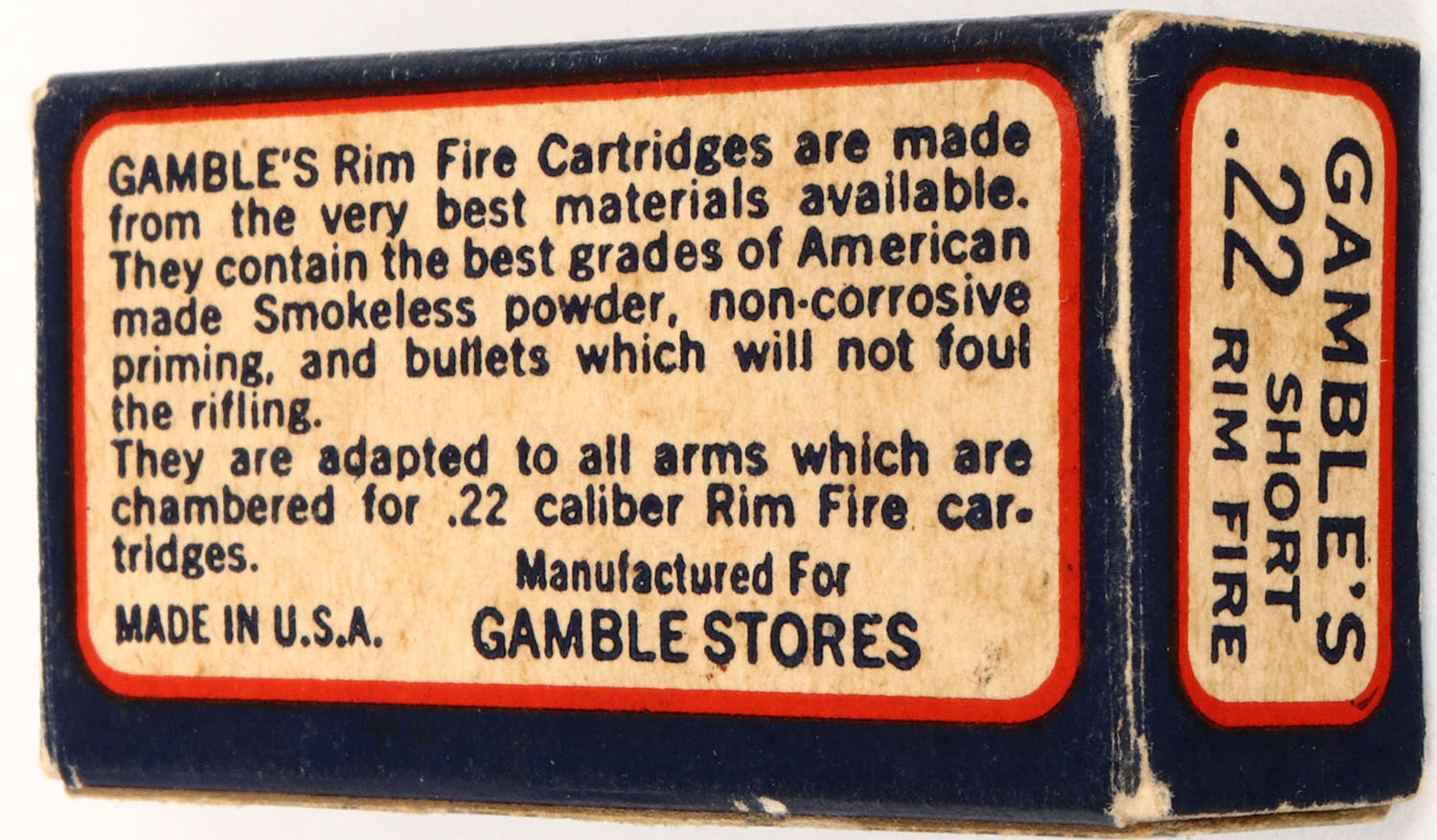 Gamble's, .22 Short, Rimfire Cartridges, RHWeb: GS-1 S-3, Full, 1pc. Blue white & red box, box is solid with excellent color, some age soiling, minor edge wear, corners are mostly sharp, end flaps are solid, ammo is very good. Grade: Excellent + - Value: 100 to 300