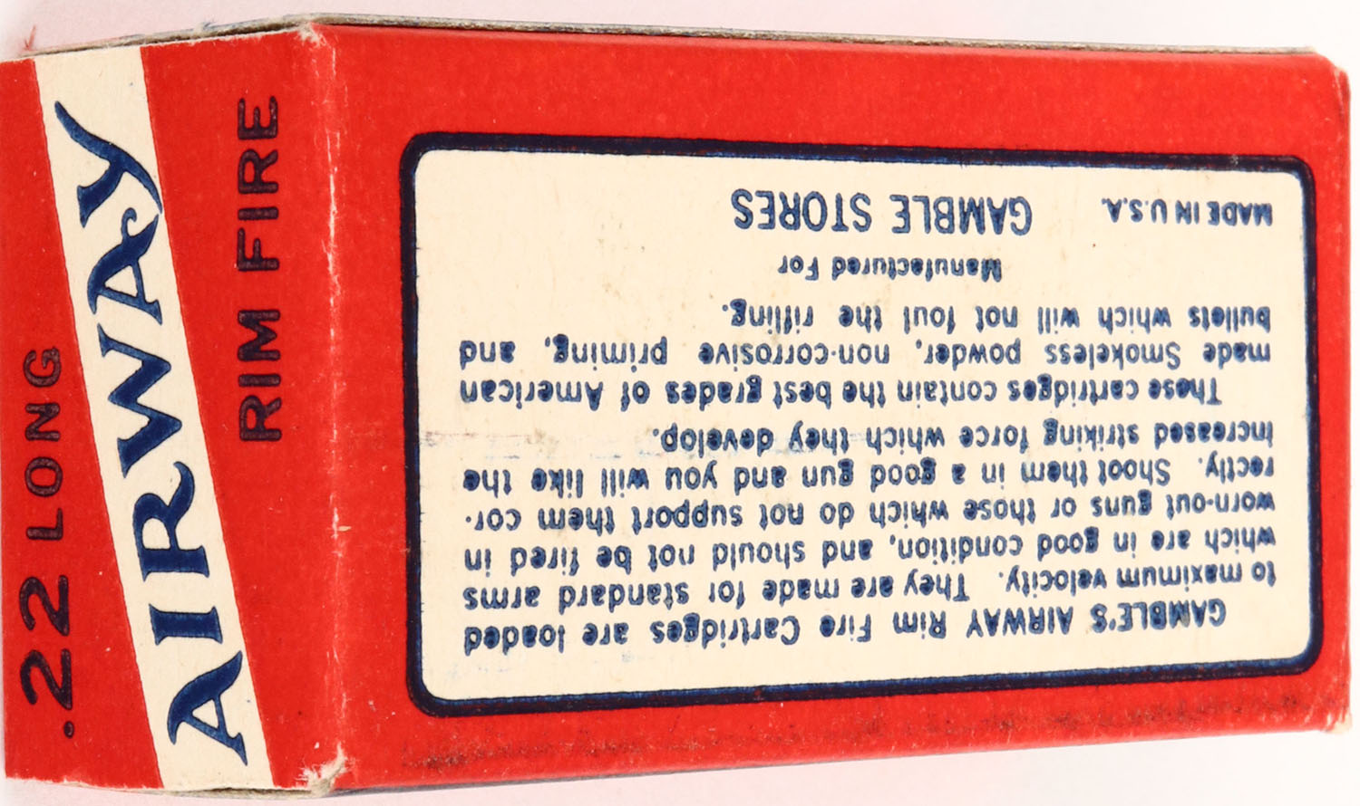 Gamble's, Airway, .22 Long, RHWeb: GS-1 L-1c, Full, 1pc. Red blue & white box, box is MINT with minty color, corners are sharp, edges are crisp, end flaps are solid, ammo is excellent. Grade: MINT - Value: 30 to 90