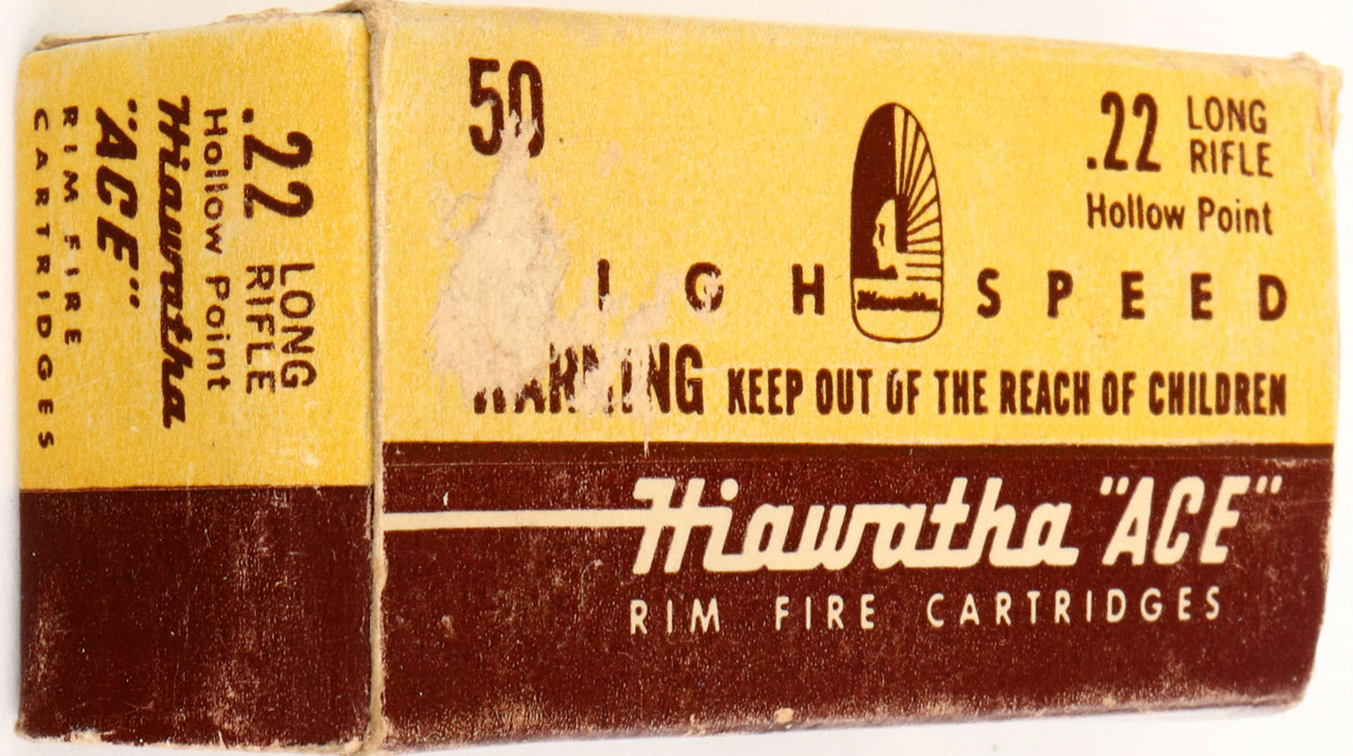 Gamble Stores, Hiawatha ''ACE'', .22 Long Rifle Hollow Point, RHWeb: GS-4 LR-2, Full, 1pc. Brown & yellow box, box is solid with very good color, shelf wear, very minor edge & corner wear, right end flap is bent, end flaps are mostly rigid, ammo is excellent. Grade: Excellent - Value: 6 to 30