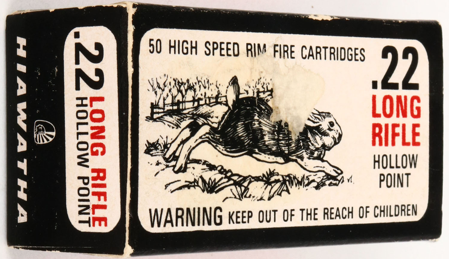 Gamble Stores, Hiawatha, .22 Long Rifle Hollow Point, RHWeb: GS-5 LR-2c, Full, 1pc. Black white & red rabbit box, box is solid with excellent to minty color, scuff on top of box, very minor corner wear, edges are crisp, end flaps are rigid, ammo is minty. Grade: Excellent ++ - Value: 20 to 60