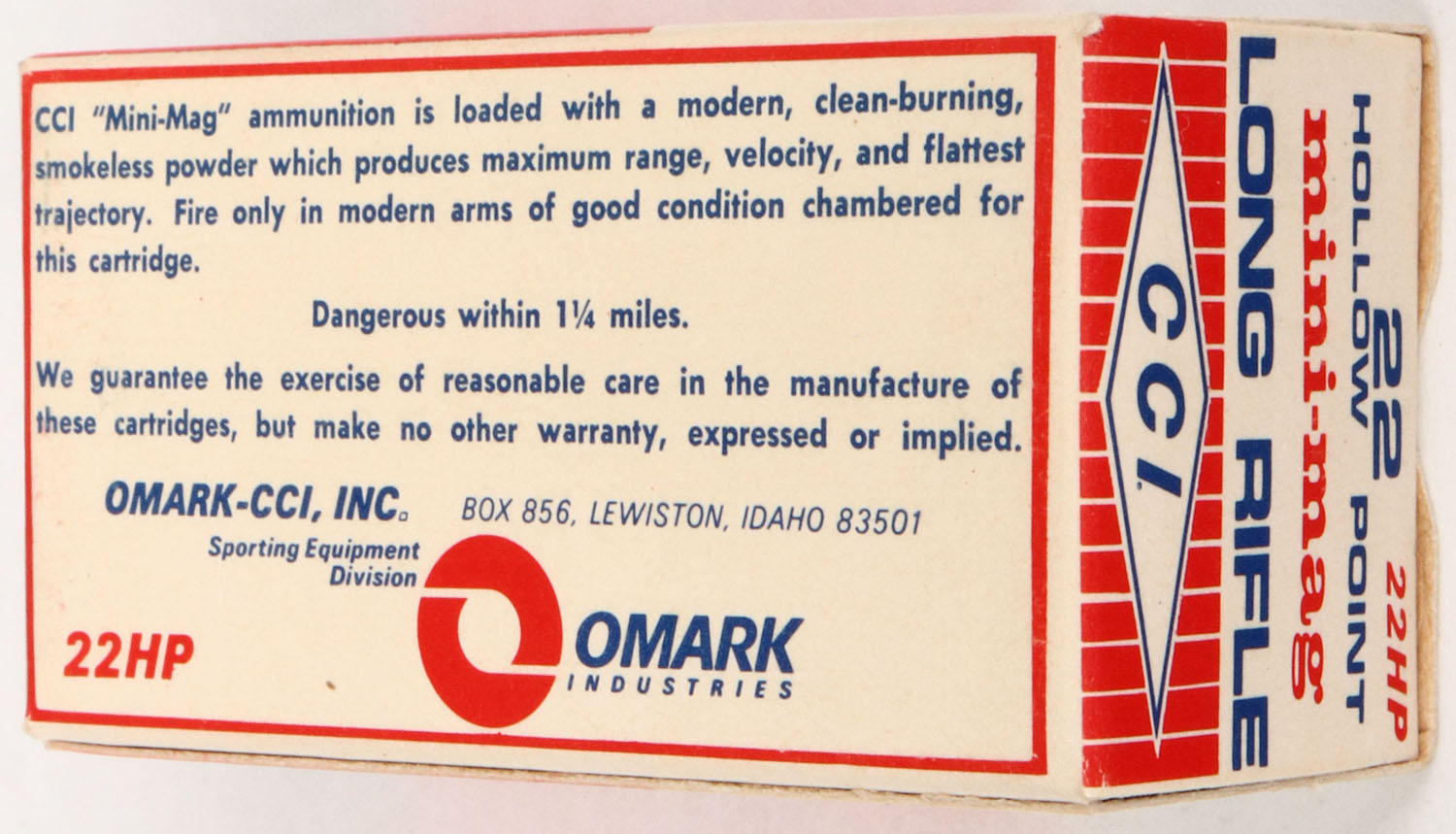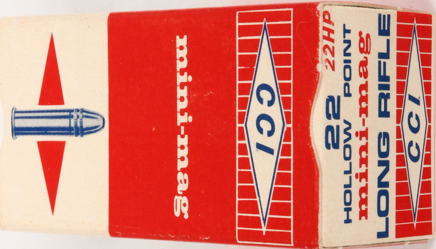 CCi, mini-mag, .22 Long Rifle Hollow Point, RHWeb: CCI-3 LR-2b, Full, 1pc. Red & white box, box is mint with minty color, corners are sharp, edges are crisp, end flaps are rigid, ammo is minty. Grade: Mint - Value: 8 to 40