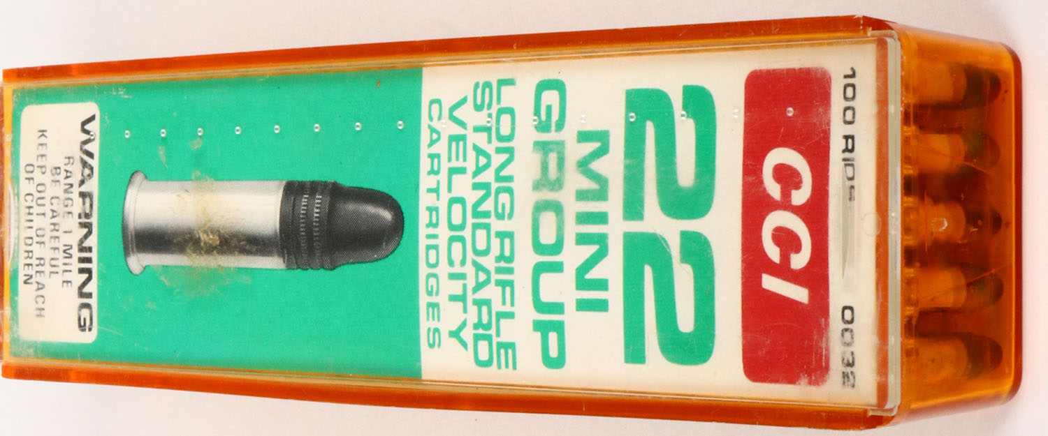 CCi, Mini Group, .22 Long Rifle, Standard Velocity, RHWeb: CCI-6 LR-3, Full, 2pc. Amber box with green & white label, box is solid, lid is somewhat cloudy, label is minty, ammo is minty. Grade: Excellent ++ - Value: 6 to 30