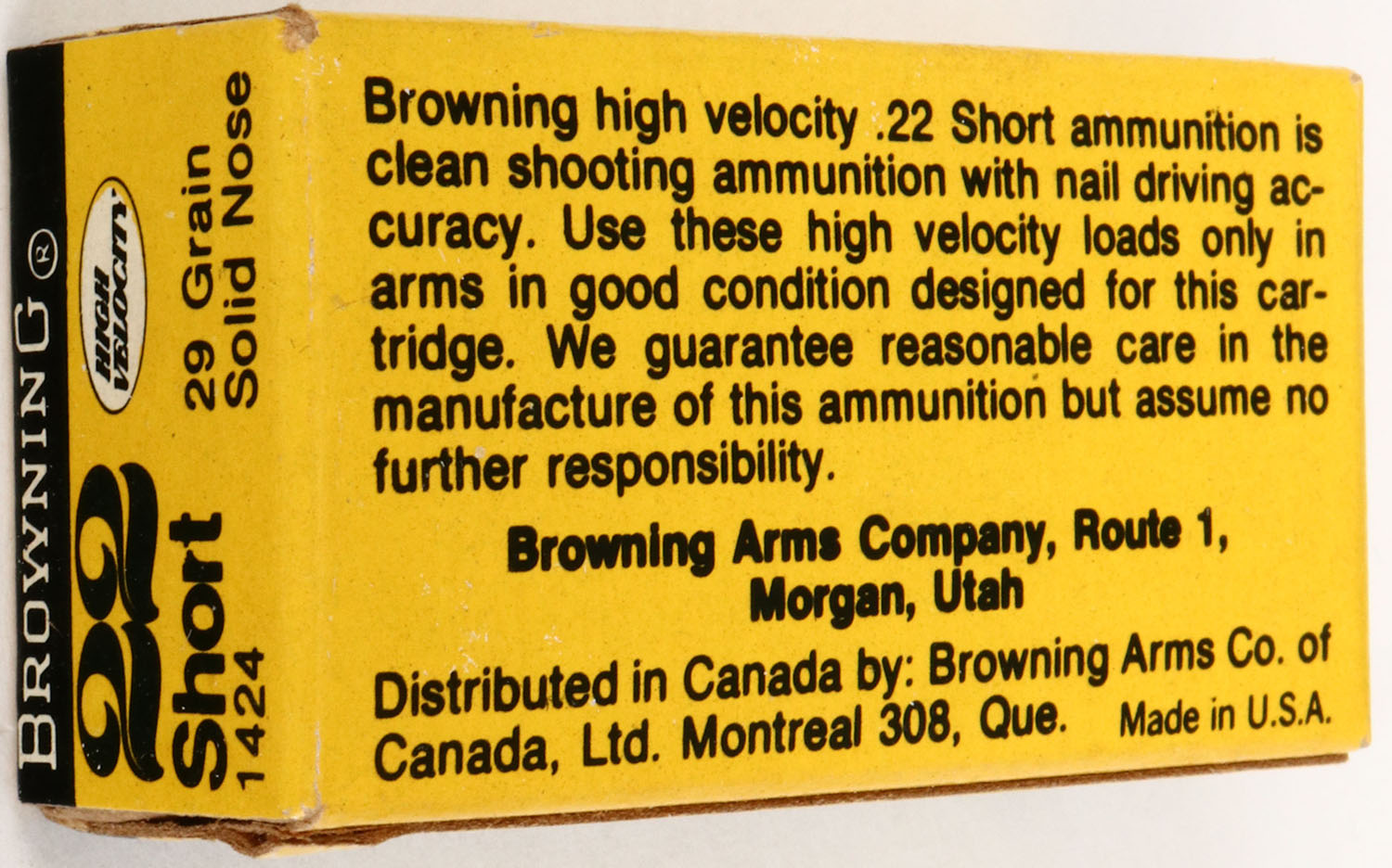 Browning, Nail Drivers, .22 Short, High Velocity, RHWeb: BROWN-1 S-1, Full, 1pc. Yellow black & white box, box is near mint with minty color, very minor corner ding on front bottom corner, corners are otherwise sharp, edges are crisp, end flaps are very rigid, ammo is minty. Grade: Mint - Value: 20 to 100