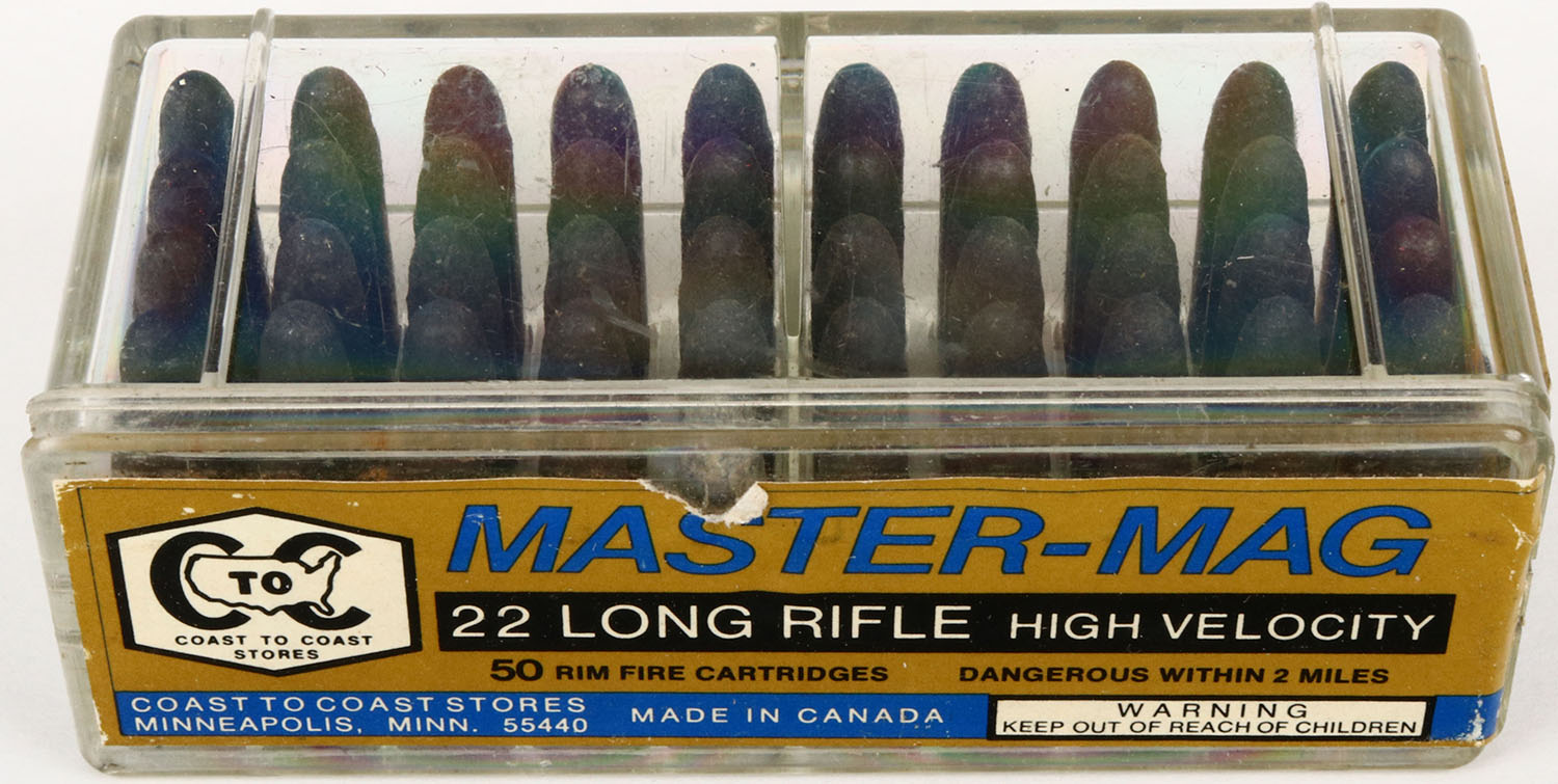 Coast to Coast, Master-Mag, .22 Long Rifle, High Velocity, RHWeb: CTC-2 LR-1.1, Full, 2pc. Clear plastic tray with bronze & blue side sealing labels, box is solid, label is 99% intact with minty color, ammo is very good. Grade: Excellent - Value: 10 to 50